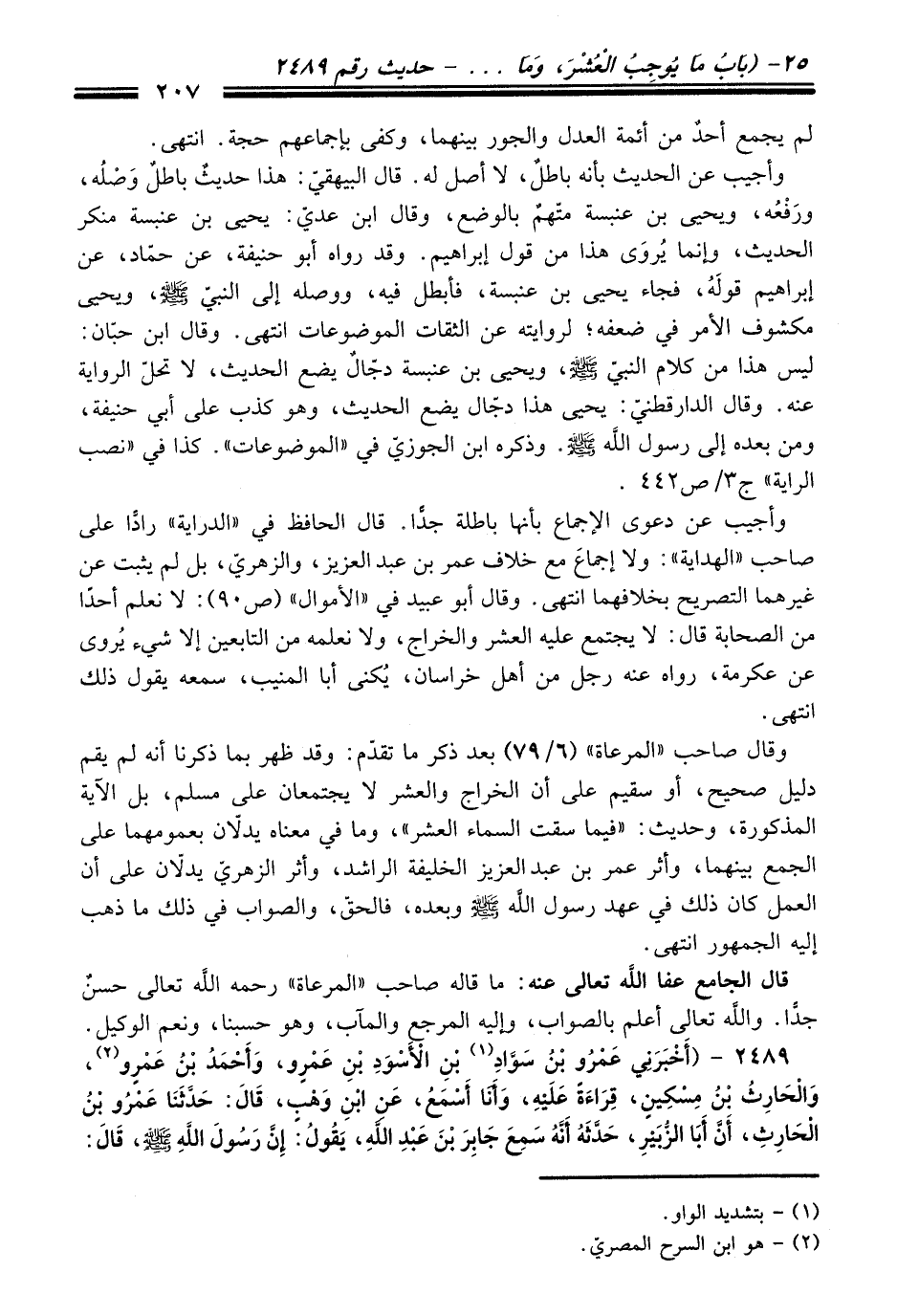 وأجيب عن دعوى الإجماع بأنها باطلة جدًّا. قال الحافظ في "الدراية" رادًّا على صاحب "الهداية": ولا إجماعَ مع خلاف عمر بن عبد العزيز، والزهريّ، بل لم يثبت عن غيرهما التصريح بخلافهما انتهى. وقال أبو عبيد في "الأموال" (ص 90): لا نعلم أحدًا من الصحابة قال: لا يجتمع عليه العشر والخراج، ولا نعلمه من التابعين إلا شيء يُروى عن عكرمة، رواه عنه رجل من أهل خراسان، يُكنى أبا المنيب، سمعه يقول ذلك انتهى.