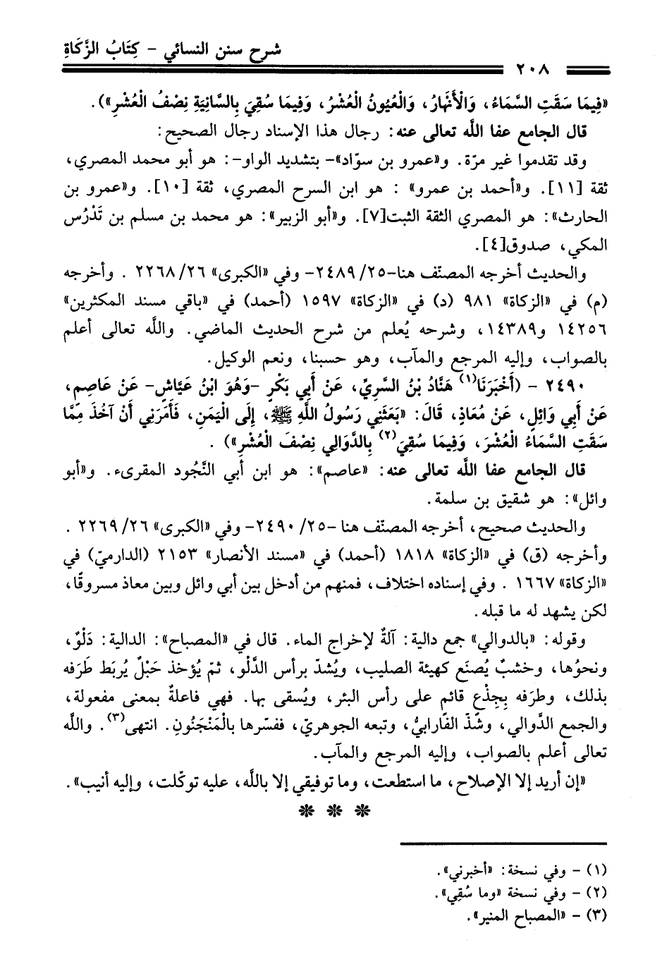 2490 - (أَخْبَرَنَا (¬1) هَنَّادُ بْنُ السَّرِيِّ, عَنْ أَبِي بَكْرٍ -وَهُوَ ابْنُ عَيَّاشٍ- عَنْ عَاصِمٍ, عَنْ أَبِي وَائِلٍ, عَنْ مُعَاذٍ, قَالَ: "بَعَثَنِي رَسُولُ اللَّهِ - صلى اللَّه عليه وسلم -, إِلَى الْيَمَنِ, فَأَمَرَنِي أَنْ آخُذَ مِمَّا سَقَتِ السَّمَاءُ الْعُشْرَ, وَفِيمَا سُقِيَ (¬2) بِالدَّوَالِي نِصْفَ الْعُشْرِ").