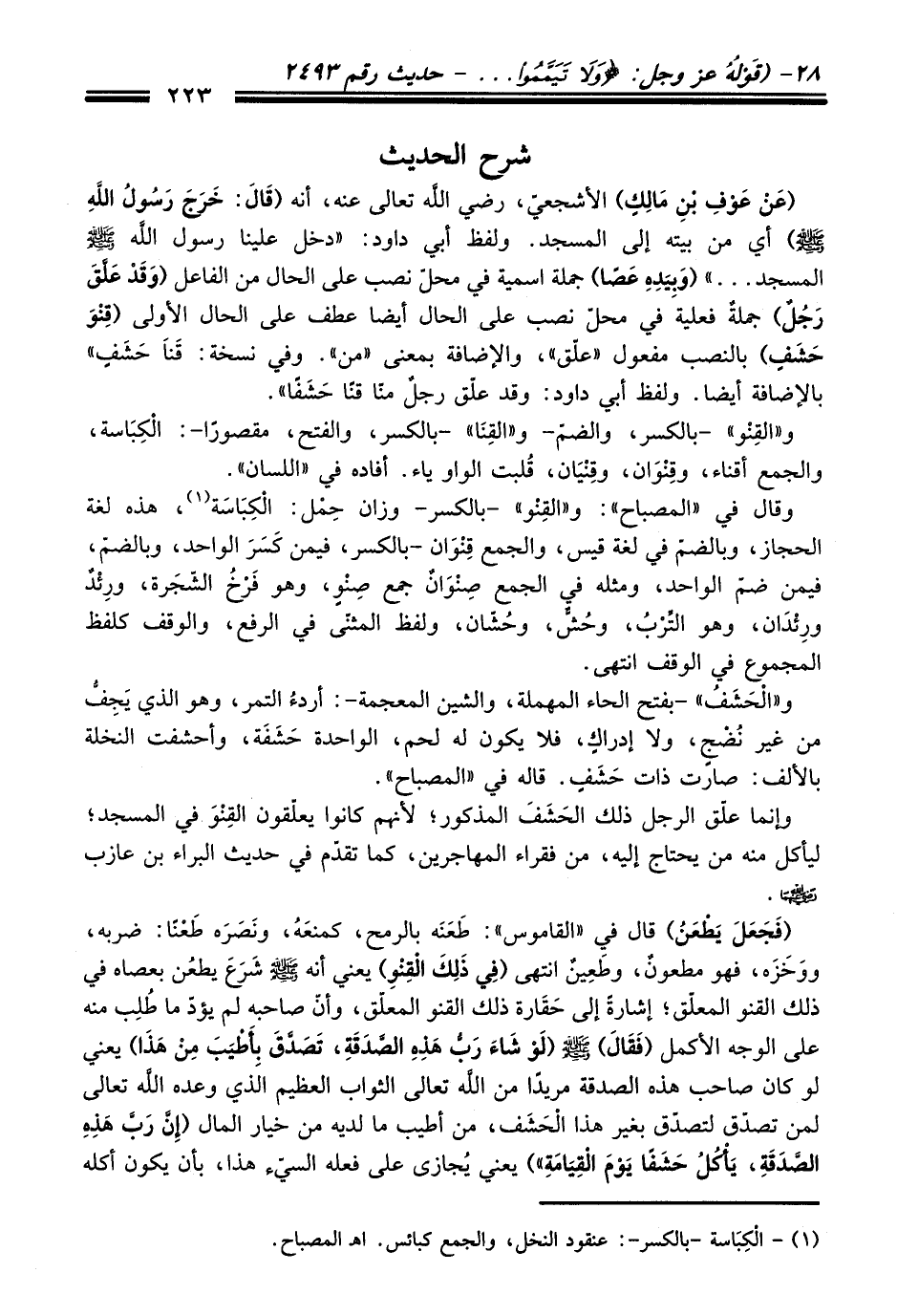 (عَنْ عَوْفِ بْنِ مَالِكٍ) الأشجعيّ، - رضي اللَّه تعالى عنه -، أنه (قَالَ: خَرَجَ رَسُولُ اللَّهِ - صلى اللَّه عليه وسلم -) أي من بيته إلى المسجد. ولفظ أبي داود: "دخل علينا رسول اللَّه - صلى اللَّه عليه وسلم - المسجد ... " (وَبيَدِهِ عَصًا) جملة اسمية في محلّ نصب على الحال من الفاعل (وَقَدْ عَلَّقَ رَجُلٌ) جملة فعليةَ في محلّ نصب على الحال أيضًا عطف على الحال الأولى (قِنْوَ حَشَفٍ) بالنصب مفعول "علّق"، والإضافة بمعنى "من". وفي نسخة: قَناَ حَشَفٍ" بالإضافة أيضا. ولفظ أبي داود: وقد علّق رجلٌ منّا قنًا حَشَفًا".