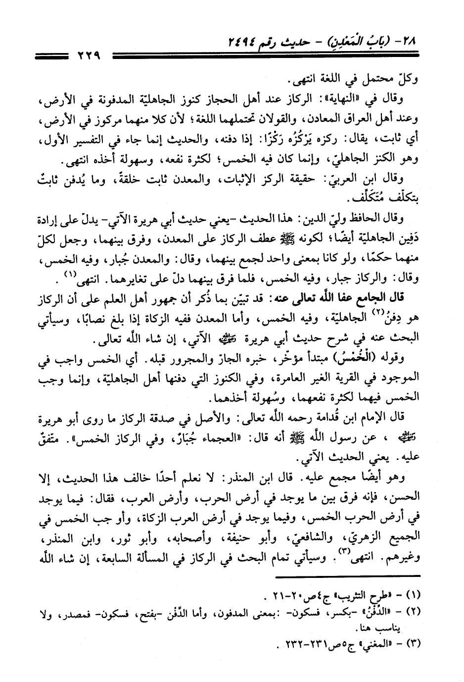 قال الجامع - عفا اللَّه تعالى عنه -: قد تبيّن بما ذُكر أن جمهور أهل العلم على أن الركاز هو دِفنُ (¬2) الجاهليّة، وفيه الخمس، وأما المعدن ففيه الزكاة إذا بلغ نصابًا، وسيأتي البحث عنه في شرح حديث أبي هريرة - رضي اللَّه عنه - الآتي، إن شاء اللَّه تعالى.