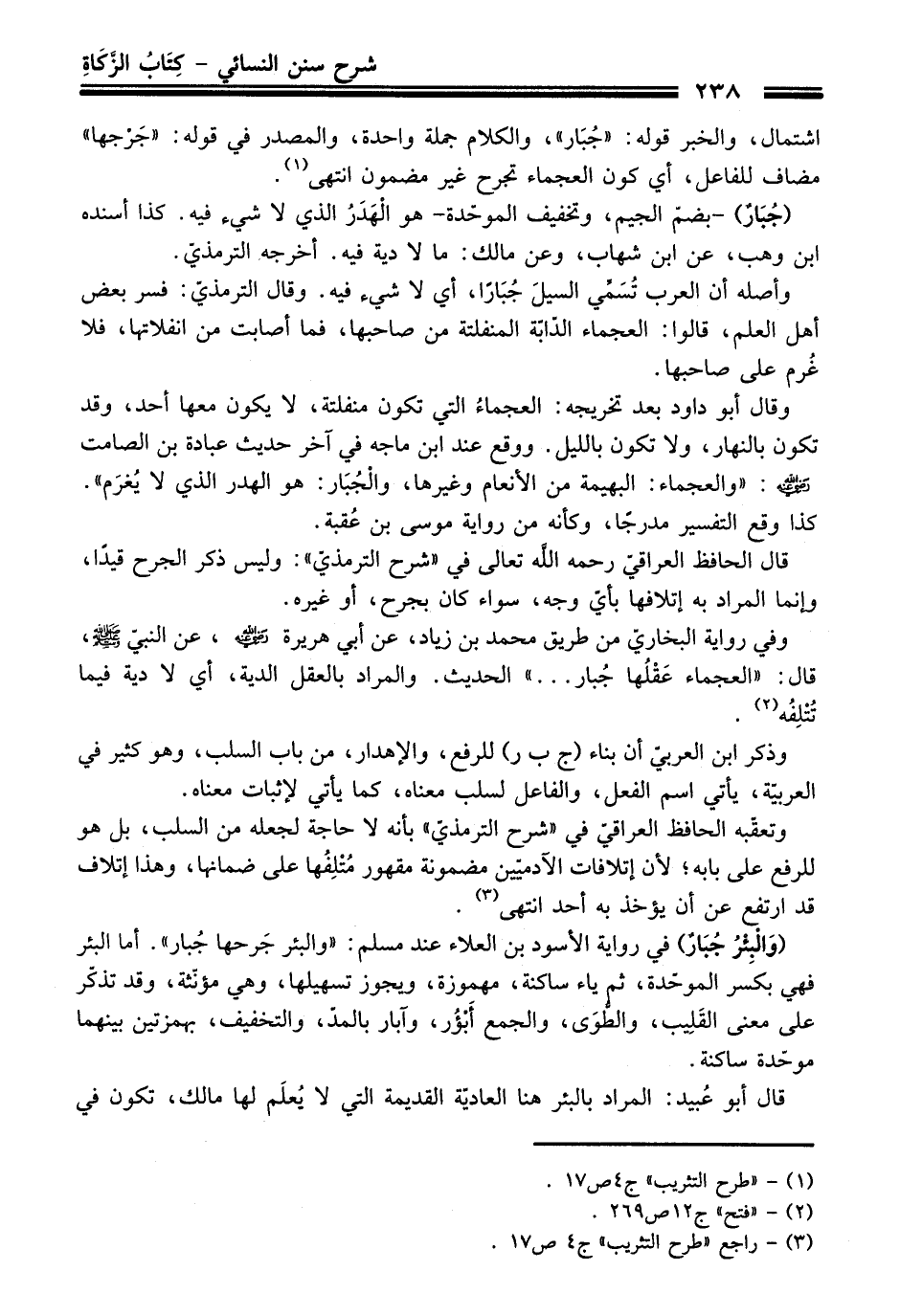 وقال أبو داود بعد تخريجه: العجماءُ التي تكون منفلتة، لا يكون معها أحد، وقد تكون بالنهار، ولا تكون بالليل. ووقع عند ابن ماجه في آخر حديث عبادة بن الصامت - رضي اللَّه عنه -: "والعجماء: البهيمة من الأنعام وغيرها، والْجُبَار: هو الهدر الذي لا يُغرَم". كذا وقع التفسير مدرجًا، وكأنه من رواية موسى بن عُقبة.