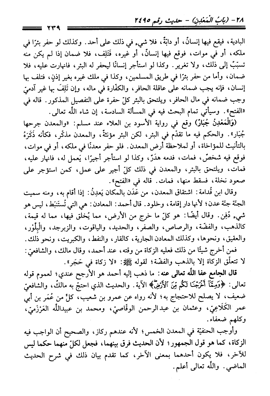 البادية، فيقع فيها إنسانٌ، أو دابّةٌ، فلا شيء في ذلك على أحد. وكذلك لو حفر بئرًا في ملكه، أو في موات، فوقع فيها إنسانٌ، أو غيره، فَتَلِف، فلا ضمان إذا لم يكن منه تسبّبٌ إلى ذلك، ولا تغرير. وكذا لو استأجر إنسانًا ليحفر له البئر، فانهارت عليه، فلا ضمان، وأما من حفر بئرًا في طريق المسلمين، وكذا في ملك غيره بغير إذنٍ، فتلف بها إنسان، فإنه يجب ضمانه على عاقلة الحافر، والكفّارة في ماله، وإن تَلِفَ بها غير آدميّ وجب ضمانه في مال الحافر، ويلتحق بالبئر كلّ حفرة على التفصيل المذكور. قاله في "الفتح". وسيأتي تمام البحث فيه في المسألة السادسة، إن شاء اللَّه تعالى.