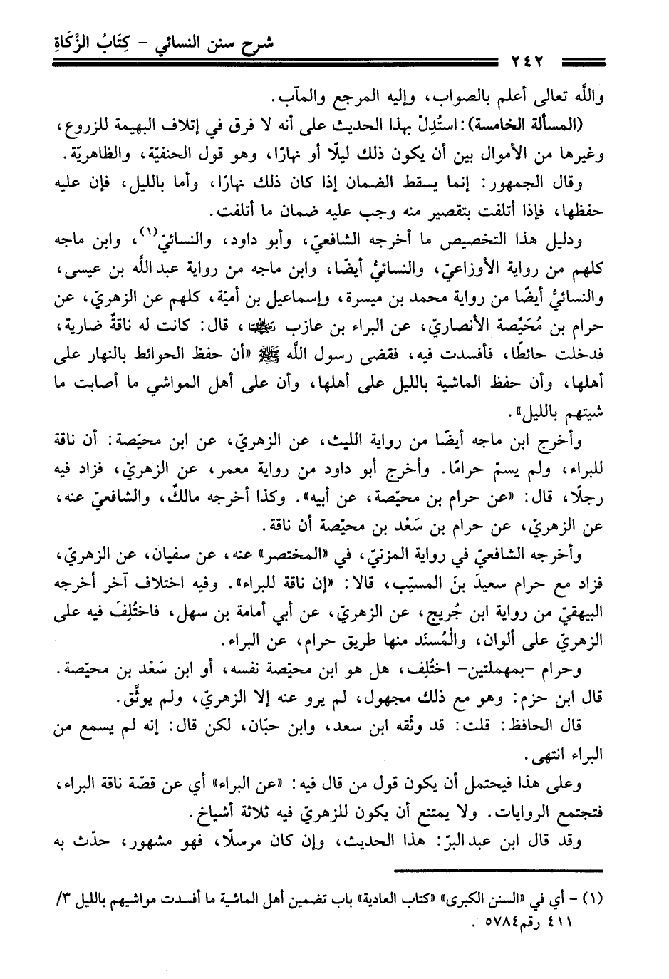 (¬1) - أي في "السنن الكبرى" "كتاب العادية" باب تضمين أهل الماشية ما أفسدت مواشيهم بالليل 3/ 411 رقم 5784.