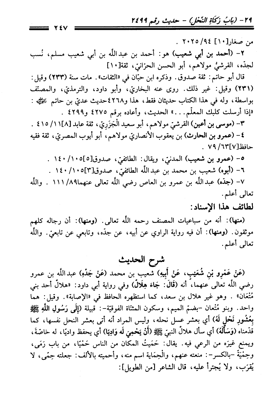 (عَنْ عَمْرِو بْنِ شُعَيْبٍ، عَنْ أَبيهِ) شعيب بن محمد (عَنْ جدِّهِ) عبد اللَّه بن عمرو - رضي اللَّه تعالى عنهما -، أنه (قَالَ: جَاءَ هِلَالٌ) وفي رواية أبي داود: "هلالٌ أحد بني مُتْعَان". وهو غير هلال بن سعد، كما استظهره الحافظ في "الإصابة". وقيل: هما واحد. وبنو مُتْعان -بضمّ الميم، وسكون المثنّاة الفوقيّة-: قبيلة (إِلَى رَسُولِ اللَّهِ - صلى اللَّه عليه وسلم - بِعُشُورِ نَحْلٍ لَهُ) أي بعشر عسل نحله، وليس المراد أنه أتى بعشر النحل نفسها، كما قدّمناه (وَسَألَهُ) أي سأل هلالٌ النبيّ - صلى اللَّه عليه وسلم - (أَنْ يَحْمِيَ لَه وَادِيًا) أي يحفظ واديًا، له خاصّةَ، ويمنع غيرَه من الرعي فيه. يقال: حَمَيتُ المكان من الناس حَمْيًا، من باب رَمَى، وحِمْيَةً -بالكسر-: منعته عنهم، والْحِمَاية اسم منه، وأحميته بالألف: جعلته حِمًى، لا يُقرَب، ولا يُجترأ عليه، قال الشاعر [من الطويل]: