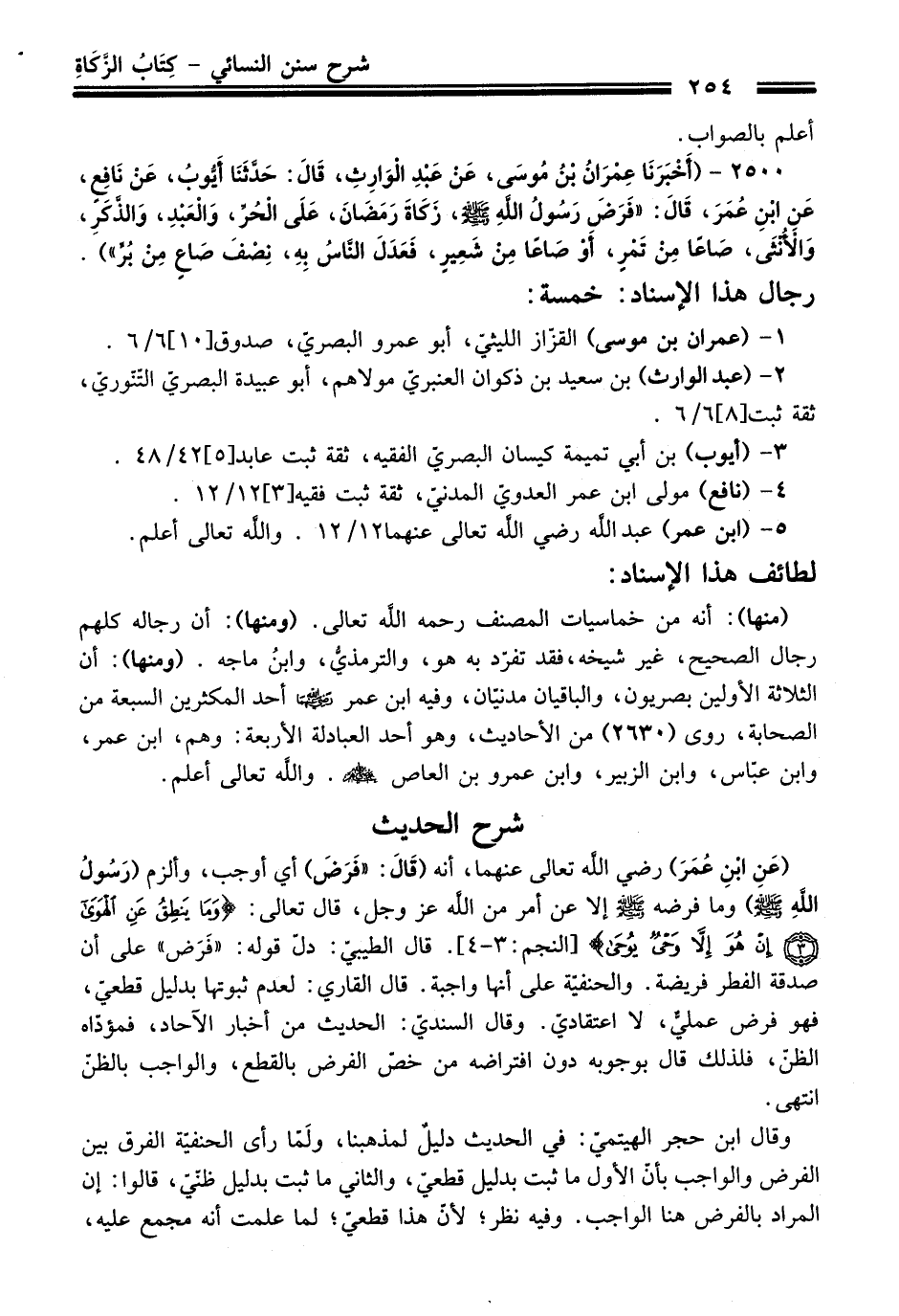 2500 - (أَخْبَرَنَا عِمْرَانُ بْنُ مُوسَى, عَنْ عَبْدِ الْوَارِثِ, قَالَ: حَدَّثَنَا أَيُّوبُ, عَنْ نَافِعٍ, عَنِ ابْنِ عُمَرَ, قَالَ: "فَرَضَ رَسُولُ اللَّهِ - صلى اللَّه عليه وسلم -, زَكَاةَ رَمَضَانَ عَلَى الْحُرِّ, وَالْعَبْدِ, وَالذَّكَرِ, وَالأُنْثَى, صَاعًا مِنْ تَمْرٍ, أَوْ صَاعًا مِنْ شَعِيرٍ, فَعَدَلَ النَّاسُ بِهِ, نِصْفَ صَاعٍ مِنْ بُرٍّ").