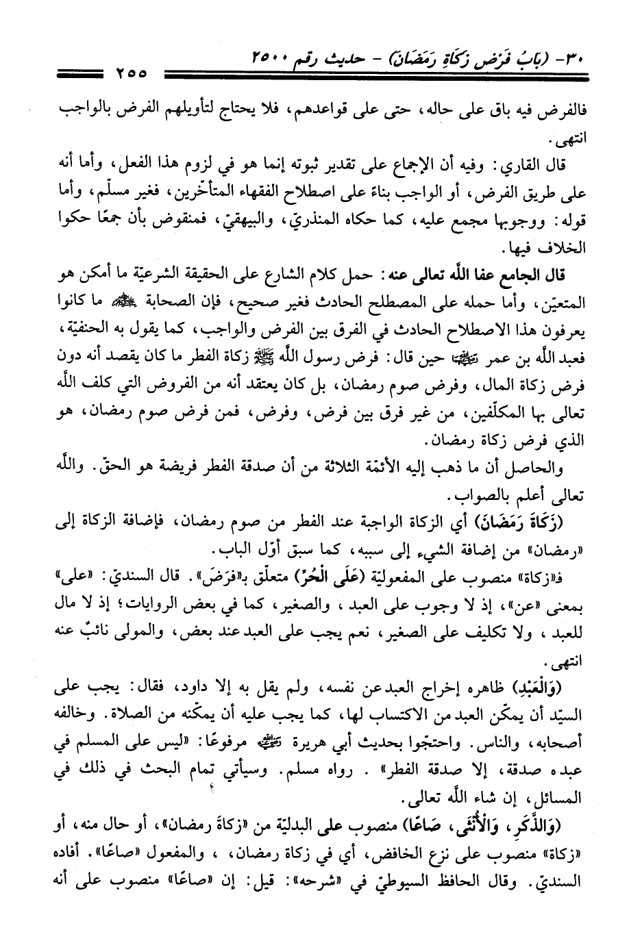 قال الجامع - عفا اللَّه تعالى عنه -: حمل كلام الشارع على الحقيقة الشرعيّة ما أمكن هو المتعيّن، وأما حمله على المصطلح الحادث فغير صحيح، فإن الصحابة - رضي اللَّه عنهم - ما كانوا يعرفون هذا الاصطلاح الحادث في الفرق بين الفرض والواجب، كما يقول به الحنفيّة، فعبد اللَّه بن عمر - رضي اللَّه عنهما - حين قال: فرض رسول اللَّه - صلى اللَّه عليه وسلم - زكاة الفطر ما كان يقصد أنه دون فرض زكاة المال، وفرض صوم رمضان، بل كان يعتقد أنه من الفروض التي كلف اللَّه تعالى بها المكلّفين، من غير فرق بين فرض، وفرض، فمن فرض صوم رمضان، هو الذي فرض زكاة رمضان.