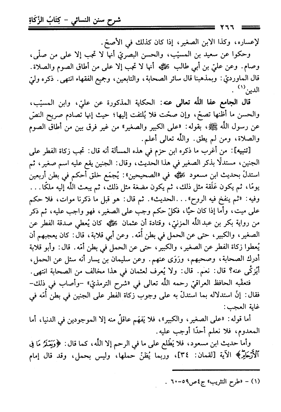 فتعقّبه الحافظ العراقيّ -رحمه اللَّه تعالى- في "شرح الترمذيّ" -وأصاب في ذلك- فقال: إنّ استدلاله بما استدلّ به على وجوب زكاة الفطر على الجنين في بطن أُمّه في غاية العجب: