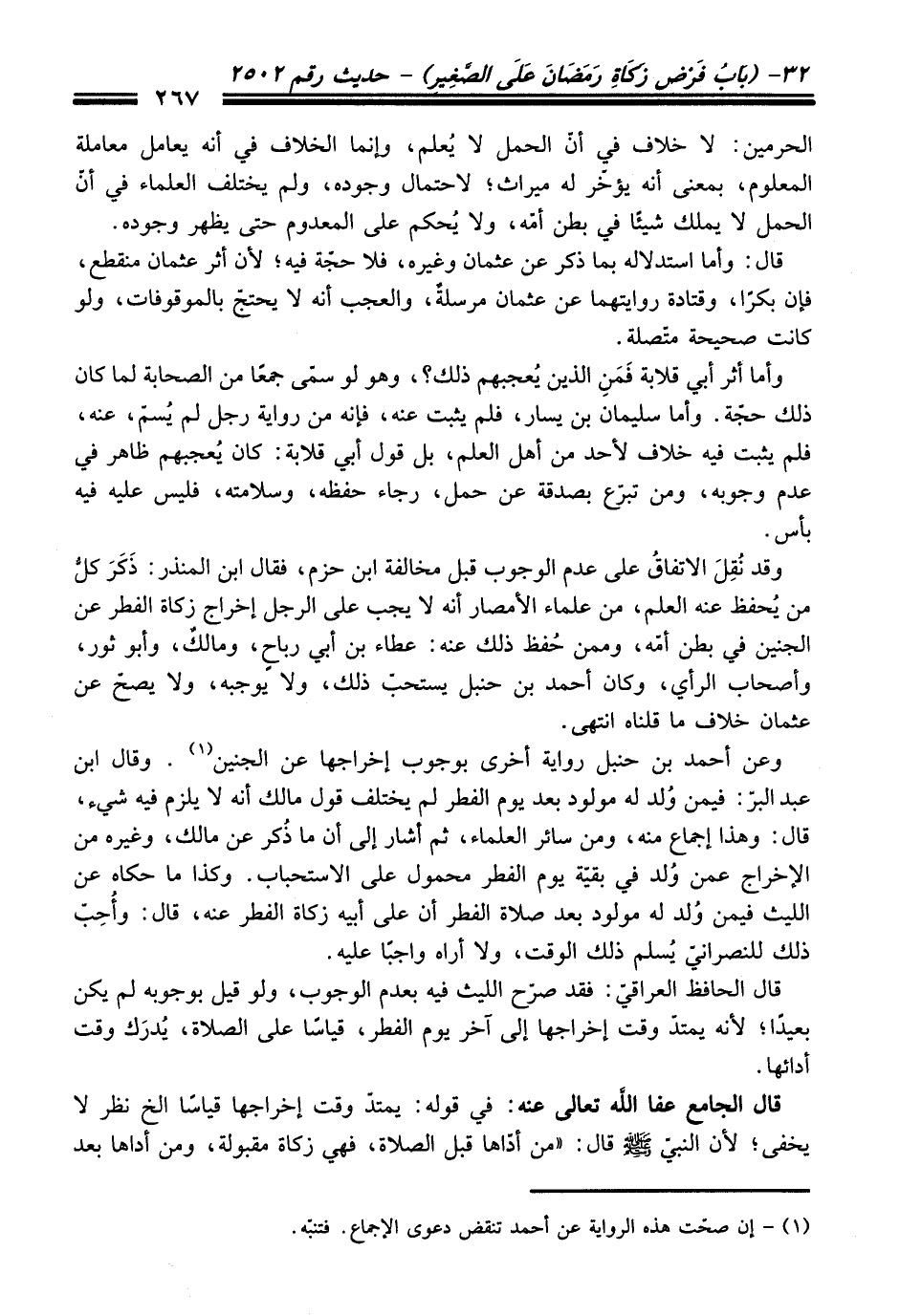 وقد نُقِلَ الاتفاقُ على عدم الوجوب قبل مخالفة ابن حزم، فقال ابن المنذر: ذَكَرَ كلُّ من يُحفظ عنه العلم، من علماء الأمصار أنه لا يجب على الرجل إخراج زكاة الفطر عن الجنين في بطن أمّة، وممن حُفظ ذلك عنه: عطاء بن أبي رباحٍ، ومالكٌ، وأبو ثور، وأصحاب الرأي، وكان أحمد بن حنبل يستحبّ ذلك، ولا يوجبه، ولا يصحّ عن عثمان خلاف ما قلناه انتهى.
