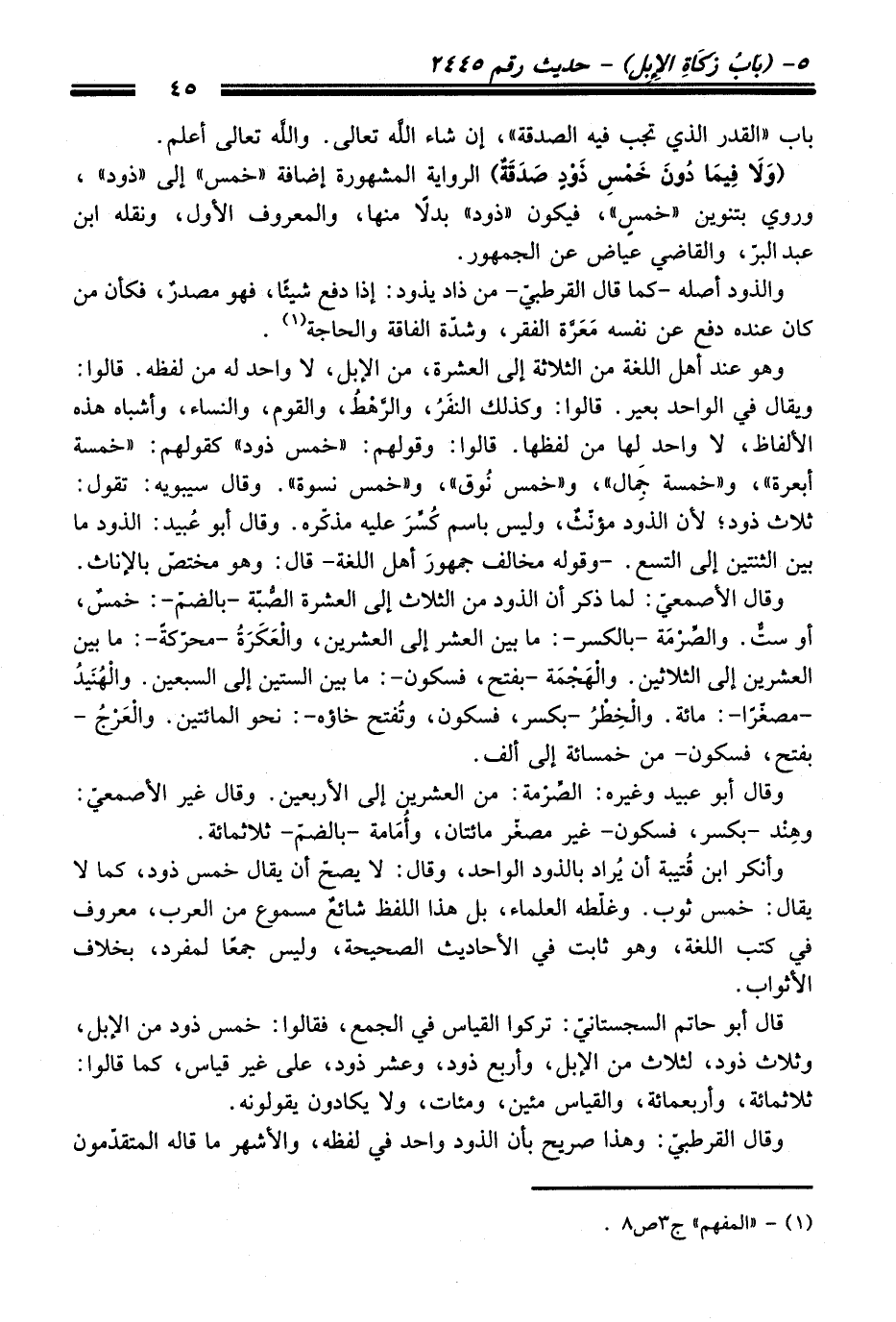 (وَلَا فِيمَا دُونَ خَمْسِ ذَوْدِ صَدَقَةٌ) الرواية المشهورة إضافة "خمس" إلى "ذود"، وروي بتنوين "خمس"، فيكون "ذود" بدلًا منها، والمعروف الأول، ونقله ابن عبد البرّ، والقاضي عياض عن الجمهور.