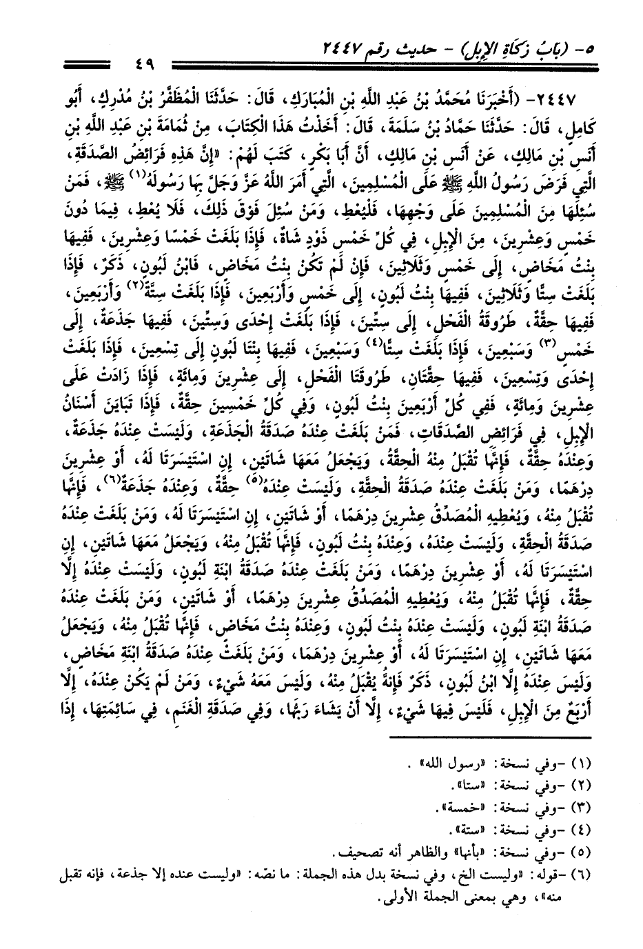 2447 - (أَخْبَرَنَا مُحَمَّدُ بْنُ عَبْدِ اللَّهِ بْنِ الْمُبَارَكِ, قَالَ: حَدَّثَنَا الْمُظَفَّرُ بْنُ مُدْرِكٍ, أَبُو كَامِلٍ, قَالَ: حَدَّثَنَا حَمَّادُ بْنُ سَلَمَةَ, قَالَ: أَخَذْتُ هَذَا الْكِتَابَ, مِنْ ثُمَامَةَ بْنِ عَبْدِ اللَّهِ بْنِ أَنَسِ بْنِ مَالِكٍ, عَنْ أَنَسِ بْنِ مَالِكٍ, أَنَّ أَبَا بَكْرٍ, كَتَبَ لَهُمْ: "إِنَّ هَذِهِ فَرَائِضُ الصَّدَقَةِ, الَّتِي فَرَضَ رَسُولُ اللَّهِ - صلى اللَّه عليه وسلم - عَلَى الْمُسْلِمِينَ, الَّتِي أَمَرَ اللَّهُ -عَزَّ وَجَلَّ- بِهَا رَسُولَهُ (¬1) - صلى اللَّه عليه وسلم -, فَمَنْ سُئِلَهَا مِنَ الْمُسْلِمِينَ عَلَى وَجْهِهَا, فَلْيُعْطِ, وَمَنْ سُئِلَ فَوْقَ ذَلِكَ, فَلاَ يُعْطِ, فِيمَا دُونَ خَمْسٍ وَعِشْرِينَ, مِنَ الإِبِلِ, فِي كُلِّ خَمْسِ ذَوْدٍ شَاةٌ, فَإِذَا بَلَغَتْ خَمْسًا وَعِشْرِينَ, فَفِيهَا بِنْتُ مَخَاضٍ, إِلَى خَمْسٍ وَثَلاَثِينَ, فَإِنْ لَمْ تَكُنْ بِنْتُ مَخَاضٍ, فَابْنُ لَبُونٍ, ذَكَرٌ, فَإِذَا بَلَغَتْ سِتًّا وَثَلاَثِينَ, فَفِيهَا بِنْتُ لَبُونٍ, إِلَى خَمْسٍ وَأَرْبَعِينَ, فَإِذَا بَلَغَتْ سِتَّةً (¬2) وَأَرْبَعِينَ, فَفِيهَا حِقَّةٌ, طَرُوقَةُ الْفَحْلِ, إِلَى سِتِّينَ, فَإِذَا بَلَغَتْ إِحْدَى وَسِتِّينَ, فَفِيهَا جَذَعَةٌ, إِلَى خَمْسٍ (¬3) وَسَبْعِينَ, فَإِذَا بَلَغَتْ سِتًّا (¬4) وَسَبْعِينَ, فَفِيهَا بِنْتَا لَبُونٍ إِلَى تِسْعِينَ, فَإِذَا بَلَغَتْ إِحْدَى وَتِسْعِينَ, فَفِيهَا حِقَّتَانِ, طَرُوقَتَا الْفَحْلِ, إِلَى عِشْرِينَ وَمِائَةٍ, فَإِذَا زَادَتْ عَلَى عِشْرِينَ وَمِائَةٍ, فَفِي كُلِّ أَرْبَعِينَ بِنْتُ لَبُونٍ, وَفِي كُلِّ خَمْسِينَ حِقَّةٌ, فَإِذَا تَبَايَنَ أَسْنَانُ الإِبِلِ, فِي فَرَائِضِ الصَّدَقَاتِ, فَمَنْ بَلَغَتْ عِنْدَهُ صَدَقَةُ الْجَذَعَةِ, وَلَيْسَتْ عِنْدَهُ جَذَعَةٌ, وَعِنْدَهُ حِقَّةٌ, فَإِنَّهَا تُقْبَلُ مِنْهُ الْحِقَّةُ, وَيَجْعَلُ مَعَهَا شَاتَيْنِ, إِنِ اسْتَيْسَرَتَا لَهُ, أَوْ عِشْرِينَ دِرْهَمًا, وَمَنْ بَلَغَتْ عِنْدَهُ صَدَقَةُ الْحِقَّةِ, وَلَيْسَتْ عِنْدَهُ (¬5) حِقَّةٌ, وَعِنْدَهُ جَذَعَةٌ (¬6) , فَإِنَّهَا تُقْبَلُ مِنْهُ, وَيُعْطِيهِ الْمُصَدِّقُ عِشْرِينَ دِرْهَمًا, أَوْ شَاتَيْنِ, إِنِ اسْتَيْسَرَتَا لَهُ, وَمَنْ بَلَغَتْ عِنْدَهُ صَدَقَةُ الْحِقَّةِ, وَلَيْسَتْ عِنْدَهُ, وَعِنْدَهُ بِنْتُ لَبُونٍ, فَإِنَّهَا تُقْبَلُ مِنْهُ, وَيَجْعَلُ مَعَهَا شَاتَيْنِ, إِنِ اسْتَيْسَرَتَا لَهُ, أَوْ عِشْرِينَ دِرْهَمًا, وَمَنْ بَلَغَتْ عِنْدَهُ صَدَقَةُ ابْنَةِ لَبُونٍ, وَلَيْسَتْ عِنْدَهُ إِلاَّ حِقَّةٌ, فَإِنَّهَا تُقْبَلُ مِنْهُ, وَيُعْطِيهِ الْمُصَدِّقُ عِشْرِينَ دِرْهَمًا, أَوْ شَاتَيْنِ, وَمَنْ بَلَغَتْ عِنْدَهُ صَدَقَةُ ابْنَةِ لَبُونٍ, وَلَيْسَتْ عِنْدَهُ بِنْتُ لَبُونٍ, وَعِنْدَهُ بِنْتُ مَخَاضٍ, فَإِنَّهَا تُقْبَلُ مِنْهُ, وَيَجْعَلُ مَعَهَا شَاتَيْنِ, إِنِ اسْتَيْسَرَتَا لَهُ, أَوْ عِشْرِينَ دِرْهَمًا, وَمَنْ بَلَغَتْ عِنْدَهُ صَدَقَةُ ابْنَةِ مَخَاضٍ, وَلَيْسَ عِنْدَهُ إِلاَّ ابْنُ لَبُونٍ, ذَكَرٌ فَإِنَّهُ يُقْبَلُ مِنْهُ, وَلَيْسَ مَعَهُ شَيْءٌ, وَمَنْ لَمْ يَكُنْ عِنْدَهُ, إِلاَّ أَرْبَعٌ مِنَ الإِبِلِ, فَلَيْسَ فِيهَا شَيْءٌ, إِلاَّ أَنْ يَشَاءَ رَبُّهَا, وَفِي صَدَقَةِ الْغَنَمِ, فِي سَائِمَتِهَا, إِذَا