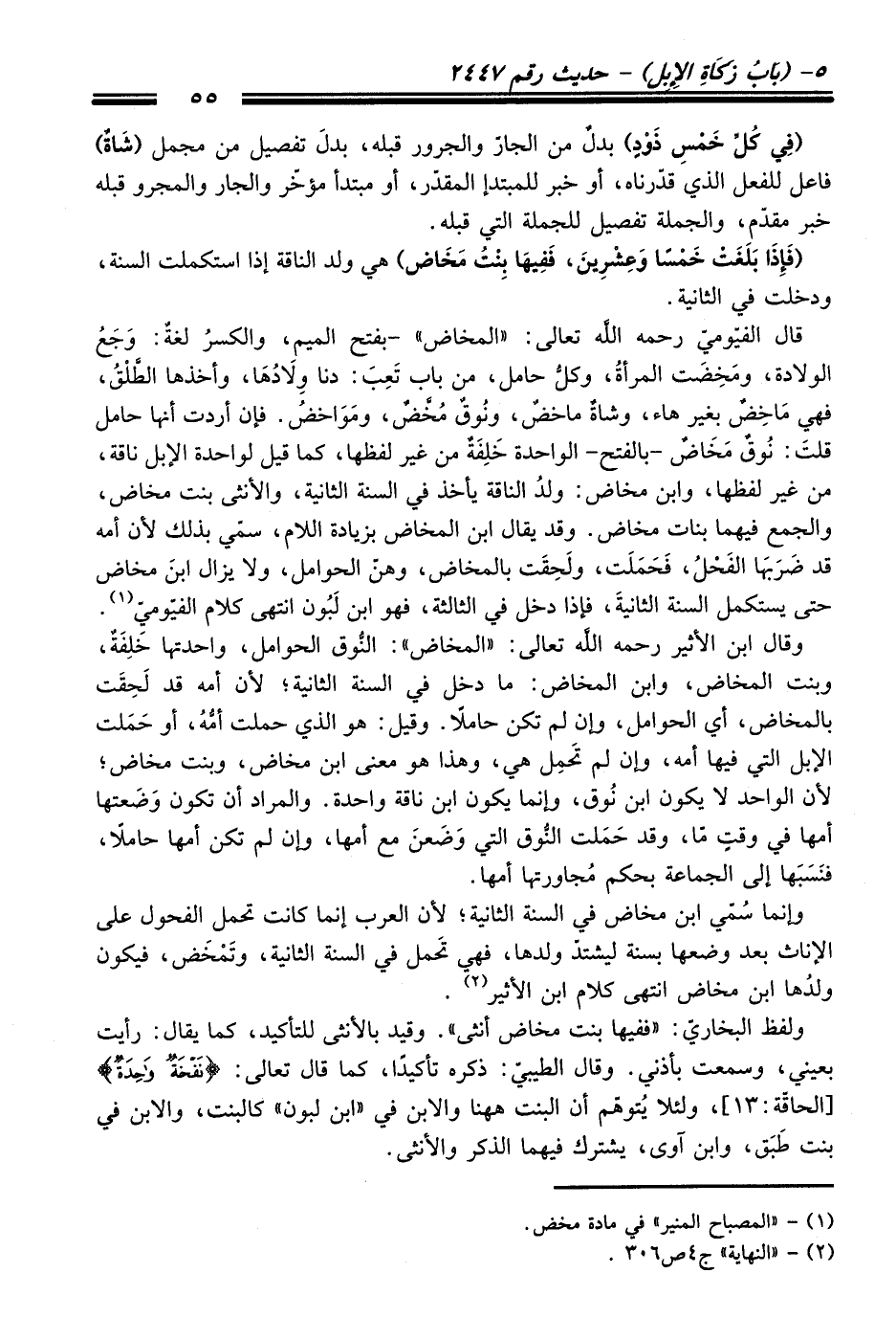 (فَإِذَا بَلَغَت خَمْسًا وَعِشْرِينَ، فَفِيهَا بِنْتُ مَخَاض) هي ولد الناقة إذا استكملت السنة، ودخلت في الثانية.
