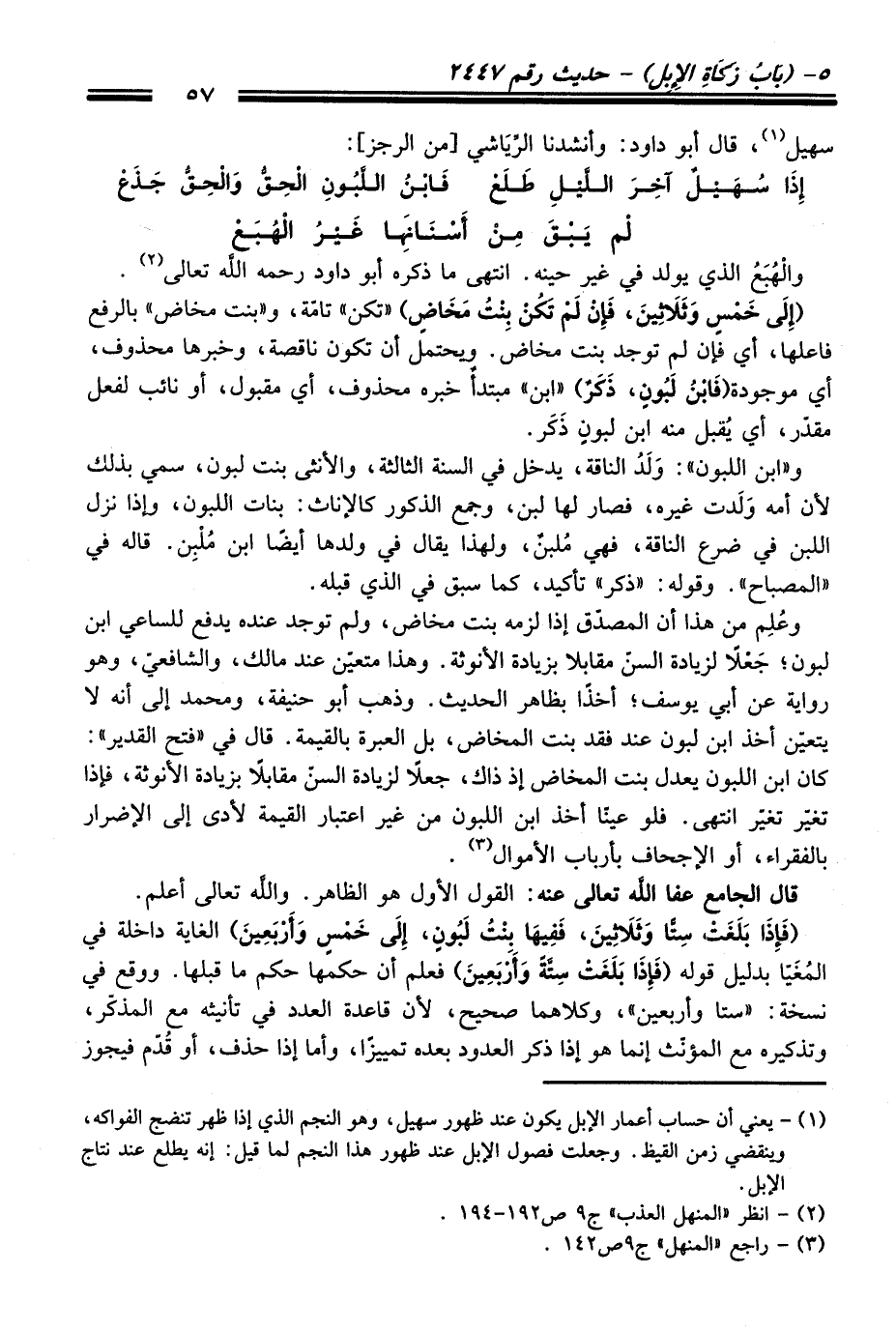 (¬1) -يعني أن حساب أعمار الإبل يكون عند ظهور سهيل، وهو النجم الذي إذا ظهر تنضج الفواكه، وينقضي زمن القيظ. وجعلت فصول الإبل عند ظهور هذا النجم لما قيل: إنه يطلع عند نتاج الإبل.