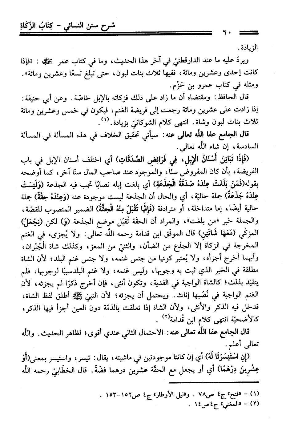 قال الحافظ: ومقتضاه أن ما زاد على ذلك فزكاته بالإبل خاصّة. وعن أبي حنيفة: إذا زادت على عشرين ومائة رجعت إلى فريضة الغنم، فيكون في خمس وعشرين ومائة ثلاث بنات لبون وشاة. انتهى كلام الشوكانيّ بزيادة. (¬1).
