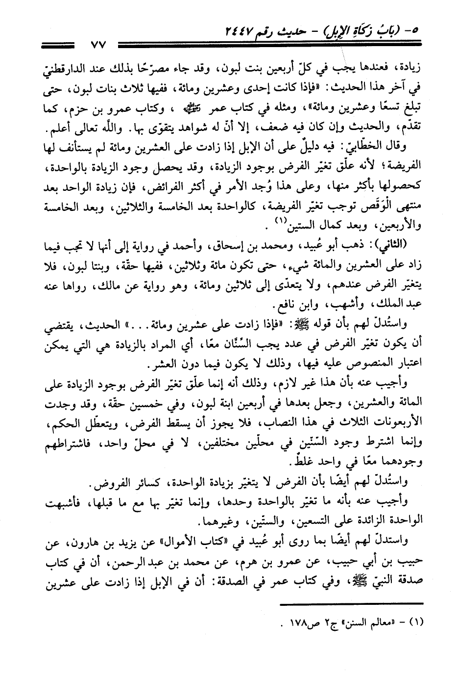 واستدلّ لهم أيضًا بما روى أبو عُبيد في "كتاب الأموال" عن يزيد بن هارون، عن حبيب بن أبي حبيب، عن عمرو بن هرم، عن محمد بن عبد الرحمن، أن في كتاب صدقة النبيّ - صلى اللَّه عليه وسلم -، وفي كتاب عمر في الصدقة: أن في الإبل إذا زادت على عشرين