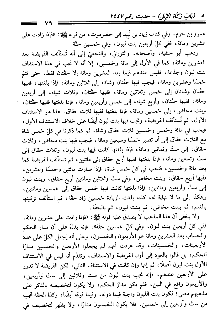 ولا يخفى أن هذا المذهب لا يصدق عليه قوله - صلى اللَّه عليه وسلم -: "فهذا زادت على عشرين ومائة، ففي كلّ أربعين بنت لبون، وفي كلّ خمسين حقة"، فإنه يدلّ على أن مدار الحكم والحساب بعد العشرين ومائة هو الأربعون والخمسون، وعلى أنه يُجعل الكلّ على عدد الأربعينات، والخمسينات، وقد عرفت أنهم لم يجعلوا الأربعين والخمسين مدارًا للحكم، بل قالوا بالعود إلى أول الفريضة والاستئناف، وتقدّم أنه ليس في الاستئناف الأول بنت لبون أصلاً، ثم إنها وإن كانت في الاستئناف الثاني، لكن الفريضة لا تدور على الأربعين عندهم، فإنه تجب بنت لبون من ست وثلاثين إلى ستّ وأربعين، والأربعون واقع في البين، فلم يكن مدارَ الحكم، ولا يكون لتخصيصه بالذكر على مذهبهم معنى؛ لكون بنت اللبون واجبة فيما دونه، وفيما فوقه أيضًا، وكذا الحقّة تجب من ستّ وأربعين إلى خمسين، فلا يكون الخمسون مدارًا، ولا يظهر لتخصيصه في