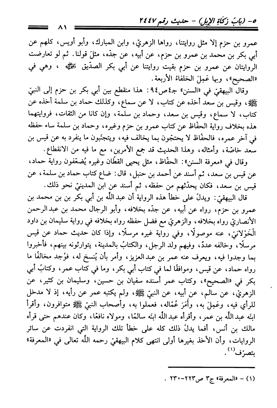 قال البيهقيّ: ويدلّ على خطأ هذه الرواية أن عبد اللَّه بن أبي بكر بن بن محمد بن عمرو بن حزم، رواه عن أبيه، عن جدّه بخلافه، وأبو الرجال محمد بن عبد الرحمن الأنصاريّ رواه بخلافه، والزهريّ مع فضل حفظه رواه بخلافه في رواية سليمان بن داود الْخَوْلانيّ، عنه موصولاً، وفي رواية غيره مرسلاً، وإذا كان حديث حماد عن قيس مرسلاً، وخالفه عددٌ، وفيهم ولد الرجل، والكتابُ بالمدينة، يتوارثونه بينهم، فأخبروا بما وجدوا فيه، ويعرف عنه عمر بن عبد العزيز، وأمر بأن يُنسخ له، فوُجد مخالفًا ما رواه حماد، عن قيس، وموافقًا لما في كتاب أبي بكر، وما في كتاب عمر، وكتابُ أبي بكر في "الصحيح"، وكتاب عمر أسنده سفيان بن حسين، وسليمان بن كثير، عن الزهريّ، عن سالم، عن أبيه، عن النبيّ - صلى اللَّه عليه وسلم -، ولم يكتبه عمر عن رأيه، إذ لا مدخل للرأي فيه، وعَمِلَ به، وأَمَرَ عُمّاله، فعملوا به، وأصحاب النبيّ - صلى اللَّه عليه وسلم - متوافرون، وأقرأ ابنَه عبد اللَّه بن عمر، وأقرأه عبد اللَّه ابنَه سالمًا، ومولاه نافعًا، وكان عندهم حتى قرأه مالك بن أنس، أفما يدلّ ذلك كله على خطأ تلك الرواية التي انفردت عن سائر الروايات، وأن الأخذ بغيرها أولى انتهى كلام البيهقيّ -رحمه اللَّه تعالى- في "المعرفة" بتصرّف (¬1).