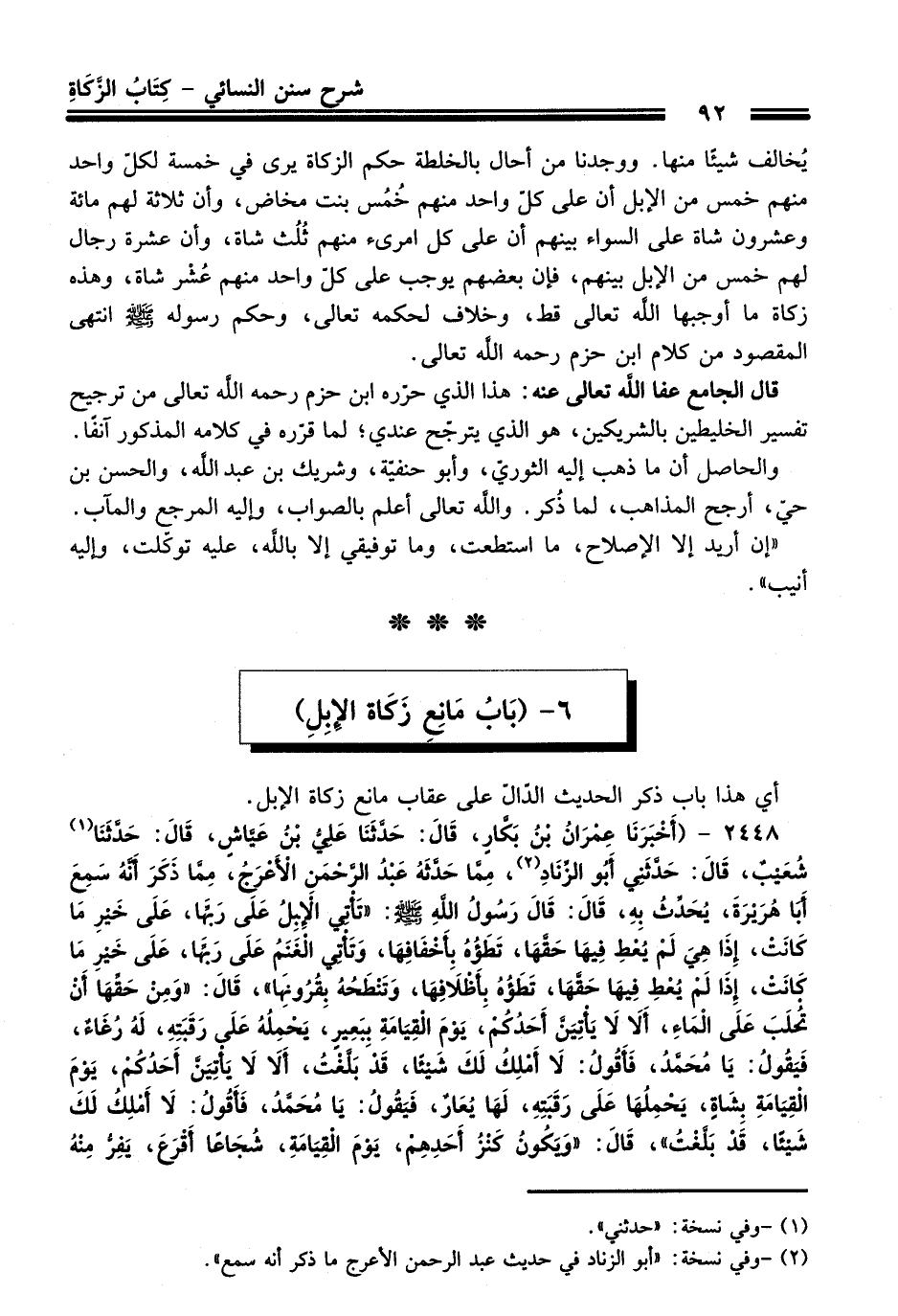 2448 - (أَخْبَرَنَا عِمْرَانُ بْنُ بَكَّارٍ, قَالَ: حَدَّثَنَا عَلِيُّ بْنُ عَيَّاشٍ, قَالَ: حَدَّثَنَا (¬1) شُعَيْبٌ, قَالَ: حَدَّثَنِي أَبُو الزِّنَادِ (¬2) , مِمَّا حَدَّثَهُ عَبْدُ الرَّحْمَنِ الأَعْرَجُ, مِمَّا ذَكَرَ أَنَّهُ سَمِعَ أَبَا هُرَيْرَةَ, يُحَدِّثُ بِهِ, قَالَ: قَالَ رَسُولُ اللَّهِ - صلى اللَّه عليه وسلم -: «تَأْتِي الإِبِلُ عَلَى رَبِّهَا, عَلَى خَيْرِ مَا كَانَتْ, إِذَا هِيَ لَمْ يُعْطِ فِيهَا حَقَّهَا, تَطَؤُهُ بِأَخْفَافِهَا, وَتَأْتِي الْغَنَمُ عَلَى رَبِّهَا, عَلَى خَيْرِ مَا كَانَتْ, إِذَا لَمْ يُعْطِ فِيهَا حَقَّهَا, تَطَؤُهُ بِأَظْلاَفِهَا, وَتَنْطَحُهُ بِقُرُونِهَا", قَالَ: "وَمِنْ حَقِّهَا أَنْ تُحْلَبَ عَلَى الْمَاءِ, أَلاَ لاَ يَأْتِيَنَّ أَحَدُكُمْ, يَوْمَ الْقِيَامَةِ بِبَعِيرٍ, يَحْمِلُهُ عَلَى رَقَبَتِهِ, لَهُ رُغَاءٌ, فَيَقُولُ: يَا مُحَمَّدُ, فَأَقُولُ: لاَ أَمْلِكُ لَكَ شَيْئًا, قَدْ بَلَّغْتُ, أَلاَ لاَ يَأْتِيَنَّ أَحَدُكُمْ, يَوْمَ الْقِيَامَةِ بِشَاةٍ, يَحْمِلُهَا عَلَى رَقَبَتِهِ, لَهَا يُعَارٌ, فَيَقُولُ: يَا مُحَمَّدُ, فَأَقُولُ: لاَ أَمْلِكُ لَكَ شَيْئًا, قَدْ بَلَّغْتُ", قَالَ: "وَيَكُونُ كَنْزُ أَحَدِهِمْ, يَوْمَ الْقِيَامَةِ, شُجَاعًا أَقْرَعَ, يَفِرُّ مِنْهُ