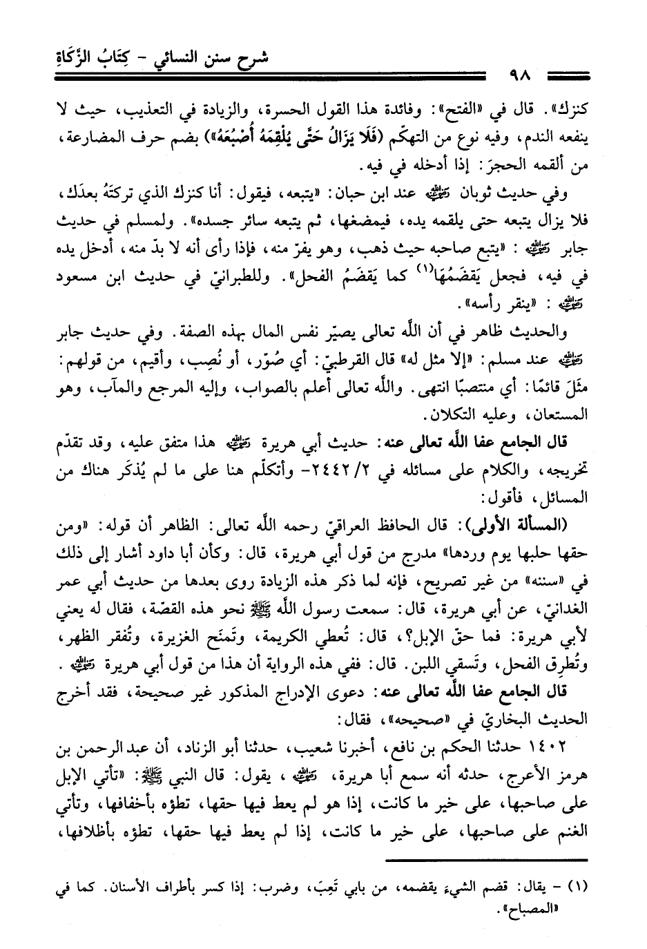 (المسالة الأولى): قال الحافظ العراقيّ -رحمه اللَّه تعالى-: الظاهر أن قوله: "ومن حقها حلبها يوم وردها" مدرج من قول أبي هريرة، قال: وكأن أبا داود أشار إلى ذلك في "سننه" من غير تصريح، فإنه لما ذكر هذه الزيادة روى بعدها من حديث أبي عمر الغدانيّ، عن أبي هريرة، قال: سمعت رسول اللَّه - صلى اللَّه عليه وسلم - نحو هذه القصّة، فقال له يعني لأبي هريرة: فما حقّ الإبل؟، قال: تُعطي الكريمة، وتَمنَح الغزيرة، وتُفقر الظهر، وتُطرِق الفحل، وتَسقي اللبن. قال: ففي هذه الرواية أن هذا من قول أبي هريرة - رضي اللَّه عنه -.