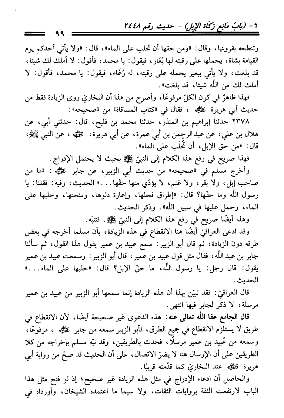 وقد ادعى العراقيّ أيضًا هنا الانقطاع في هذه الزيادة، بأن مسلما أخرجه في بعض طرقه دون الزيادة، ثم قال أبو الزبير: سمع عبيد بن عمير يقول هذا القول، ثم سألنا جابر بن عبد اللَّه، فقال مثل قول عبيد بن عمير، قال أبو الزبير: وسمعت عبيد بن عمير يقول: قال رجل: يا رسول اللَّه، ما حقّ الإبل؟ قال: "حلبها على الماء ... " الحديث.