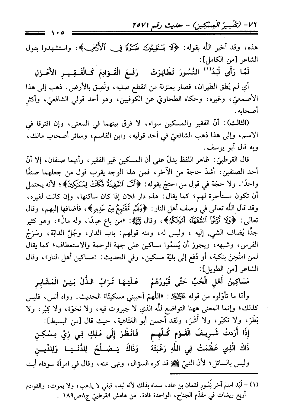 قال القرطبيّ: ظاهر اللفظ يدلّ على أن المسكين غير الفقير، وأنهما صنفان، إلا أنّ أحد الصنفين، أشدّ حاجة من الآخر، فمن هذا الوجه يقرب قول من جعلهما صنفًا واحدًا. ولا حجّة في قول من احتجّ بقوله: {أَمَّا السَّفِينَةُ فَكَانَتْ لِمَسَاكِينَ}؛ لأنه يحتمل أن تكون مستأجرة لهم؛ كما يقال: هذه دار فلان إذا كان ساكنها، وإن كانت لغيره، وقد قال اللَّه تعالى في وصف أهل النار: {وَلَهُمْ مَقَامِعُ مِنْ حَدِيدٍ}، فأضافها إليهم، وقال تعالى: {وَلَا تُؤْتُوا السُّفَهَاءَ أَمْوَالَكُمُ}، وقال - صلى اللَّه عليه وسلم -: "من باع عبدًا، وله مالٌ"، وهو كثير جدًّا يُضاف الشيء إليه، وليس له، ومنه قولهم: باب الدار، وجُلُّ الدابّة، وسَرْجُ الفرس، وشبهه، ويجوز أن يُسمَّوا مساكين على جهة الرحمة والاستعطاف؛ كما يقال لمن امتُحِنَ بنكبة، أو دُفع إلى بليّة مسكين، وفي الحديث: "مساكين أهل النار"، وقال الشاعر [من الطويل]: