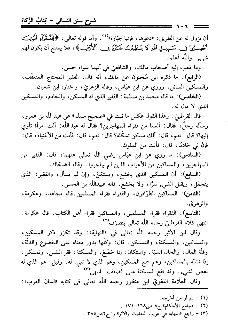 وقال ابن الأثير -رحمه اللَّه تعالى- في "النهاية": وقد تكرّر ذكر المسكين، والمساكين، والمسكنة، والتمسكن. قال: وكلّها يدور معناه على الخضوع والذلّة، وقلّة المال، والحال السيّئة. واستكان: إذا خَضَعَ، والمسكنة: فقر النفس، وتمسكن: إذا تشبّه بالمساكين، وهم جمع المسكين، وهو الذي لا شيء له. وقيل: هو الذي له بعض الشيء. وقد تقع المسكنة على الضعف. انتهى (¬3).
