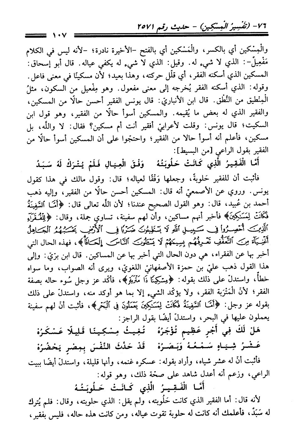 فأثبت أن للفقير حَلوبةً، وجعلها وَفْقًا لعياله؛ قال: وقول مالك في هذا كقول يونس. وروي عن الأصمعيّ أنه قال: المسكين أحسن حالًا من الفقير، وإليه ذهب أحمد بن عُبيد، قال: وهو القول الصحيح عندنا؛ لأن اللَّه تعالى قال: {أَمَّا السَّفِينَةُ فَكَانَتْ لِمَسَاكِينَ} فأخبر أنهم مساكين، وأن لهم سفينة، تساوي جملة، وقال: {لِلْفُقَرَاءِ الَّذِينَ أُحْصِرُوا فِي سَبِيلِ اللَّهِ لَا يَسْتَطِيعُونَ ضَرْبًا فِي الْأَرْضِ يَحْسَبُهُمُ الْجَاهِلُ أَغْنِيَاءَ مِنَ التَّعَفُّفِ تَعْرِفُهُمْ بِسِيمَاهُمْ لَا يَسْأَلُونَ النَّاسَ إِلْحَافًا}، فهذه الحال التي أخبر بها عن الفقراء، هي دون الحال التي أخبر بها عن المساكين. قال ابن برّيّ: وإلى هذا القول ذهب عليّ بن حمزة الأصفهانيّ اللغويّ، ويرى أنه الصواب، وما سواه خطأٌ، واستدلّ على ذلك بقوله: {مِسْكِينًا ذَا مَتْرَبَةٍ}، فأكّد -عَزَّ وَجَلَّ- سُوء حاله بصفة الفقر؛ لأن الْمَتْرَبة الفقر، ولا يؤكّد الشيء إلا بما هو أوكد منه، واستدلّ على ذلك بقوله -عَزَّ وَجَلَّ-: {أَمَّا السَّفِينَةُ فَكَانَتْ لِمَسَاكِينَ يَعْمَلُونَ فِي الْبَحْرِ}، فأثبت أنّ لهم سفينة يعملون عليها في البحر، واستدلّ أيضًا بقول الراجز: