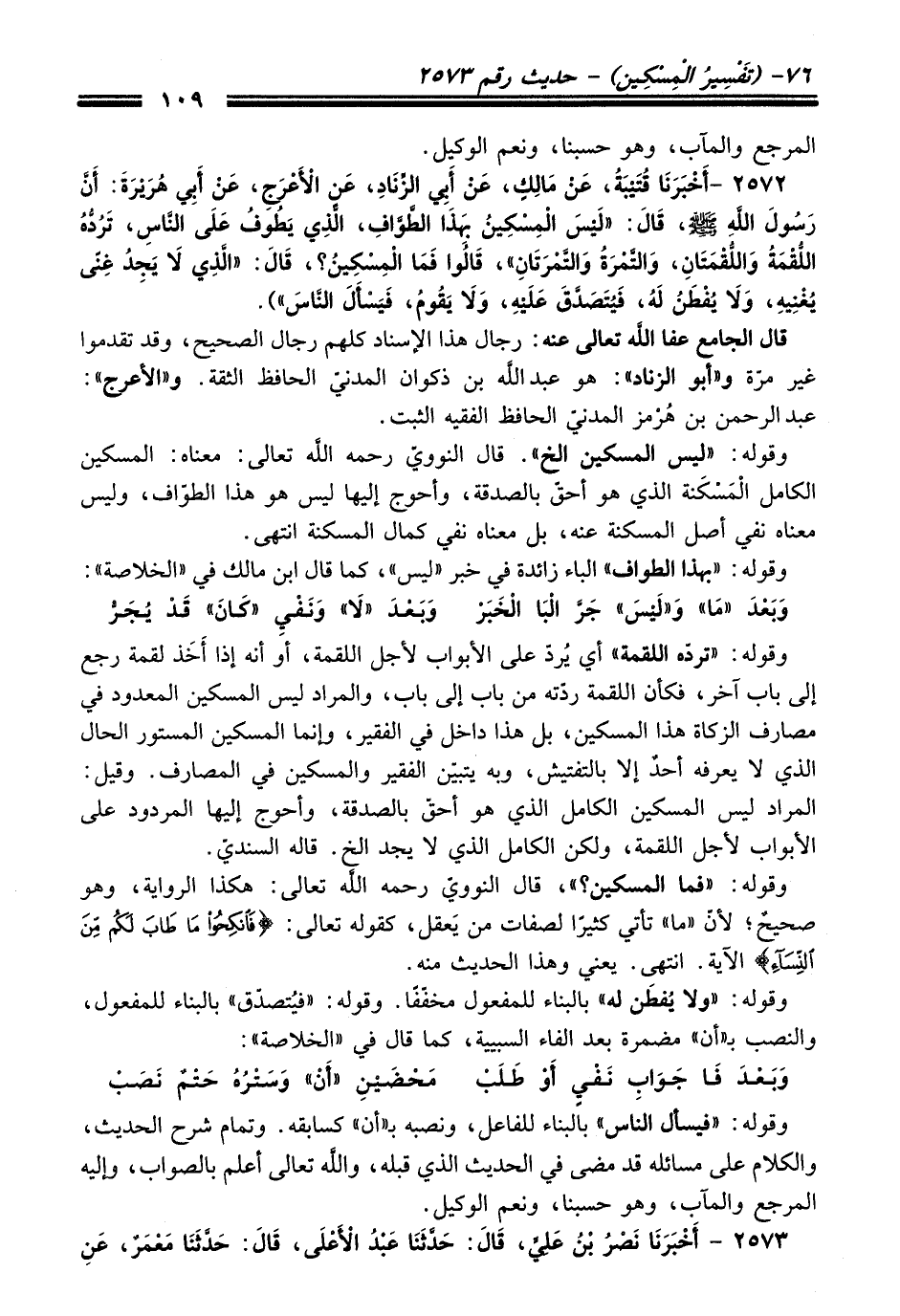 2572 - (أَخْبَرَنَا قُتَيْبَةُ,, عَنْ مَالِكٍ, عَنْ أَبِي الزِّنَادِ, عَنِ الأَعْرَجِ, عَنْ أَبِي هُرَيْرَةَ,: أَنَّ رَسُولَ اللَّهِ - صلى اللَّه عليه وسلم -, قَالَ: «لَيْسَ الْمِسْكِينُ بِهَذَا الطَّوَّافِ, الَّذِي يَطُوفُ عَلَى النَّاسِ, تَرُدُّهُ اللُّقْمَةُ وَاللُّقْمَتَانِ, وَالتَّمْرَةُ وَالتَّمْرَتَانِ» , قَالُوا فَمَا الْمِسْكِينُ؟ , قَالَ: «الَّذِي لاَ يَجِدُ غِنًى يُغْنِيهِ, وَلاَ يُفْطَنُ لَهُ, فَيُتَصَدَّقَ عَلَيْهِ, وَلاَ يَقُومُ فَيَسْأَلَ النَّاسَ»).