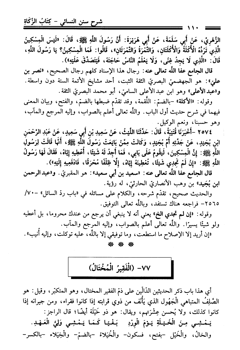 الزُّهْرِيِّ, عَنْ أَبِي سَلَمَةَ, عَنْ أَبِي هُرَيْرَةَ,: أَنَّ رَسُولَ اللَّهِ - صلى اللَّه عليه وسلم -, قَالَ: «لَيْسَ الْمِسْكِينُ الَّذِي تَرُدُّهُ الأُكْلَةُ وَالأُكْلَتَانِ, وَالتَّمْرَةُ وَالتَّمْرَتَانِ» , قَالُوا: فَمَا الْمِسْكِينُ؟ يَا رَسُولَ اللَّهِ, قَالَ: «الَّذِي لاَ يَجِدُ غِنًى, وَلاَ يَعْلَمُ النَّاسُ حَاجَتَهُ, فَيُتَصَدَّقَ عَلَيْهِ»).