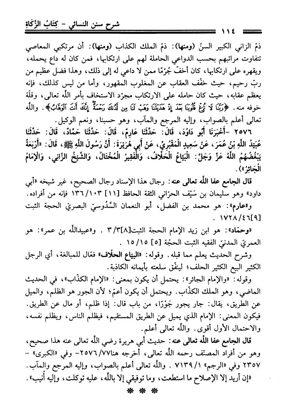 2576 - (أَخْبَرَنَا أَبُو دَاوُدَ قَالَ: حَدَّثَنَا عَارِمٌ, قَالَ: حَدَّثَنَا حَمَّادٌ, قَالَ: حَدَّثَنَا عُبَيْدُ اللَّهِ بْنُ عُمَرَ, عَنْ سَعِيدٍ الْمَقْبُرِيِّ, عَنْ أَبِي هُرَيْرَةَ: أَنَّ رَسُولَ اللَّهِ - صلى اللَّه عليه وسلم -, قَالَ: «أَرْبَعَةٌ يُبْغِضُهُمُ اللَّهُ -عَزَّ وَجَلَّ-: الْبَيَّاعُ الْحَلاَّفُ, وَالْفَقِيرُ الْمُخْتَالُ, وَالشَّيْخُ الزَّانِي, وَالإِمَامُ الْجَائِرُ»).