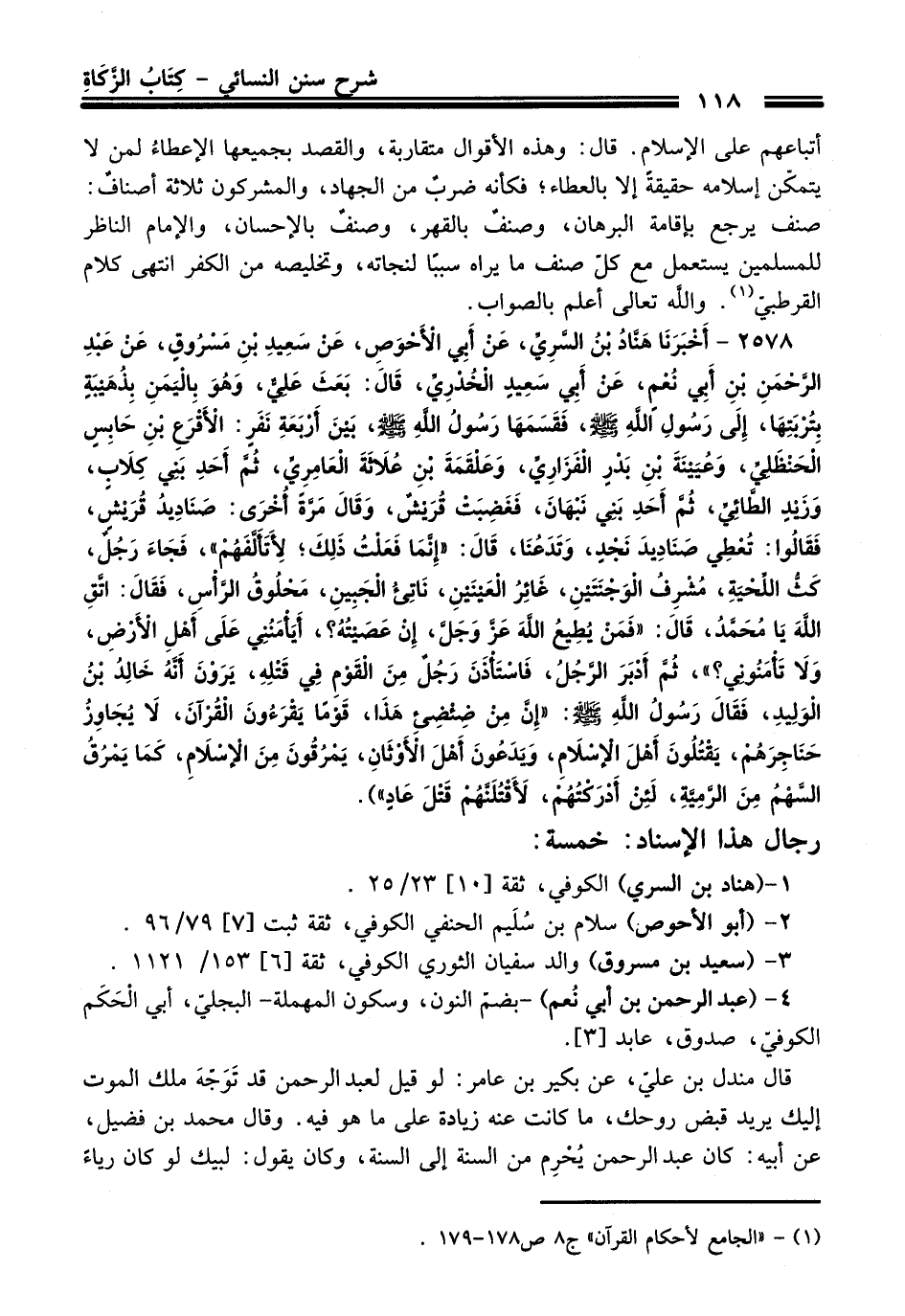 2578 - (أَخْبَرَنَا هَنَّادُ بْنُ السَّرِيِّ, عَنْ أَبِي الأَحْوَصِ, عَنْ سَعِيدِ بْنِ مَسْرُوقٍ, عَنْ عَبْدِ الرَّحْمَنِ بْنِ أَبِي نُعْمٍ, عَنْ أَبِي سَعِيدٍ الْخُدْرِيِّ, قَالَ: بَعَثَ عَلِيٌّ, وَهُوَ بِالْيَمَنِ بِذُهَيْبَةٍ بِتُرْبَتِهَا, إِلَى رَسُولِ اللَّهِ - صلى اللَّه عليه وسلم -, فَقَسَمَهَا رَسُولُ اللَّهِ - صلى اللَّه عليه وسلم -, بَيْنَ أَرْبَعَةِ نَفَرٍ: الأَقْرَعِ بْنِ حَابِسٍ الْحَنْظَلِيِّ, وَعُيَيْنَةَ بْنِ بَدْرٍ الْفَزَارِيِّ, وَعَلْقَمَةَ بْنِ عُلاَثَةَ الْعَامِرِيِّ, ثُمَّ أَحَدِ بَنِي كِلاَبٍ, وَزَيْدٍ الطَّائِيِّ, ثُمَّ أَحَدِ بَنِي نَبْهَانَ, فَغَضِبَتْ قُرَيْشٌ, وَقَالَ مَرَّةً أُخْرَى: صَنَادِيدُ قُرَيْشٍ, فَقَالُوا: تُعْطِي صَنَادِيدَ نَجْدٍ, وَتَدَعُنَا, قَالَ: «إِنَّمَا فَعَلْتُ ذَلِكَ؛ لأَتَأَلَّفَهُمْ» , فَجَاءَ رَجُلٌ, كَثُّ اللِّحْيَةِ, مُشْرِفُ الْوَجْنَتَيْنِ, غَائِرُ الْعَيْنَيْنِ, نَاتِئُ الْجَبِينِ, مَحْلُوقُ الرَّأْسِ, فَقَالَ: اتَّقِ اللَّهَ يَا مُحَمَّدُ, قَالَ: «فَمَنْ يُطِعِ اللَّهَ -عَزَّ وَجَلَّ-, إِنْ عَصَيْتُهُ أَيَأْمَنُنِي عَلَى أَهْلِ الأَرْضِ, وَلاَ تَأْمَنُونِي؟» , ثُمَّ أَدْبَرَ الرَّجُلُ, فَاسْتَأْذَنَ رَجُلٌ مِنَ الْقَوْمِ فِي قَتْلِهِ, يَرَوْنَ أَنَّهُ خَالِدُ بْنُ الْوَلِيدِ, فَقَالَ رَسُولُ اللَّهِ - صلى اللَّه عليه وسلم -: «إِنَّ مِنْ ضِئْضِئِ هَذَا قَوْمًا يَقْرَءُونَ الْقُرْآنَ, لاَ يُجَاوِزُ حَنَاجِرَهُمْ, يَقْتُلُونَ أَهْلَ الإِسْلاَمِ, وَيَدَعُونَ أَهْلَ الأَوْثَانِ, يَمْرُقُونَ مِنَ الإِسْلاَمِ, كَمَا يَمْرُقُ السَّهْمُ مِنَ الرَّمِيَّةِ, لَئِنْ أَدْرَكْتُهُمْ, لأَقْتُلَنَّهُمْ قَتْلَ عَادٍ»).