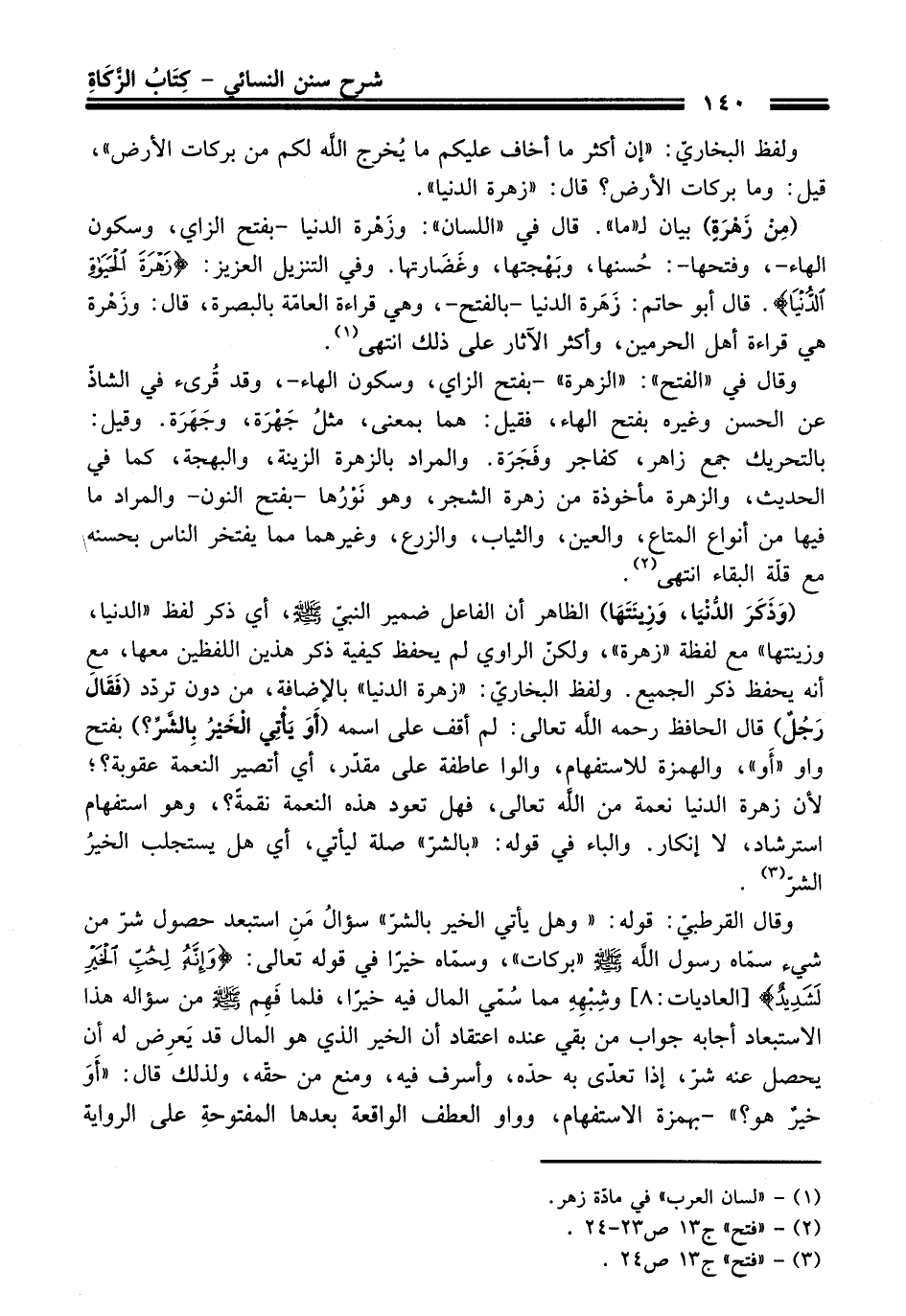 وقال في "الفتح": "الزهرة" -بفتح الزاي، وسكون الهاء-، وقد قُرىء في الشاذّ عن الحسن وغيره بفتح الهاء، فقيل: هما بمعنى، مثلُ جَهْرَة، وجَهَرَة. وقيل: بالتحريك جمع زاهر، كفاجر وفَجَرَة. والمراد بالزهرة الزينة، والبهجة، كما في الحديث، والزهرة مأخوذة من زهرة الشجر، وهو نَوْرُها -بفتح النون- والمراد ما فيها من أنواع المتاع، والعين، والثياب، والزرع، وغيرهما مما يفتخر الناس بحسنه مع قلّة البقاء انتهى (¬2).