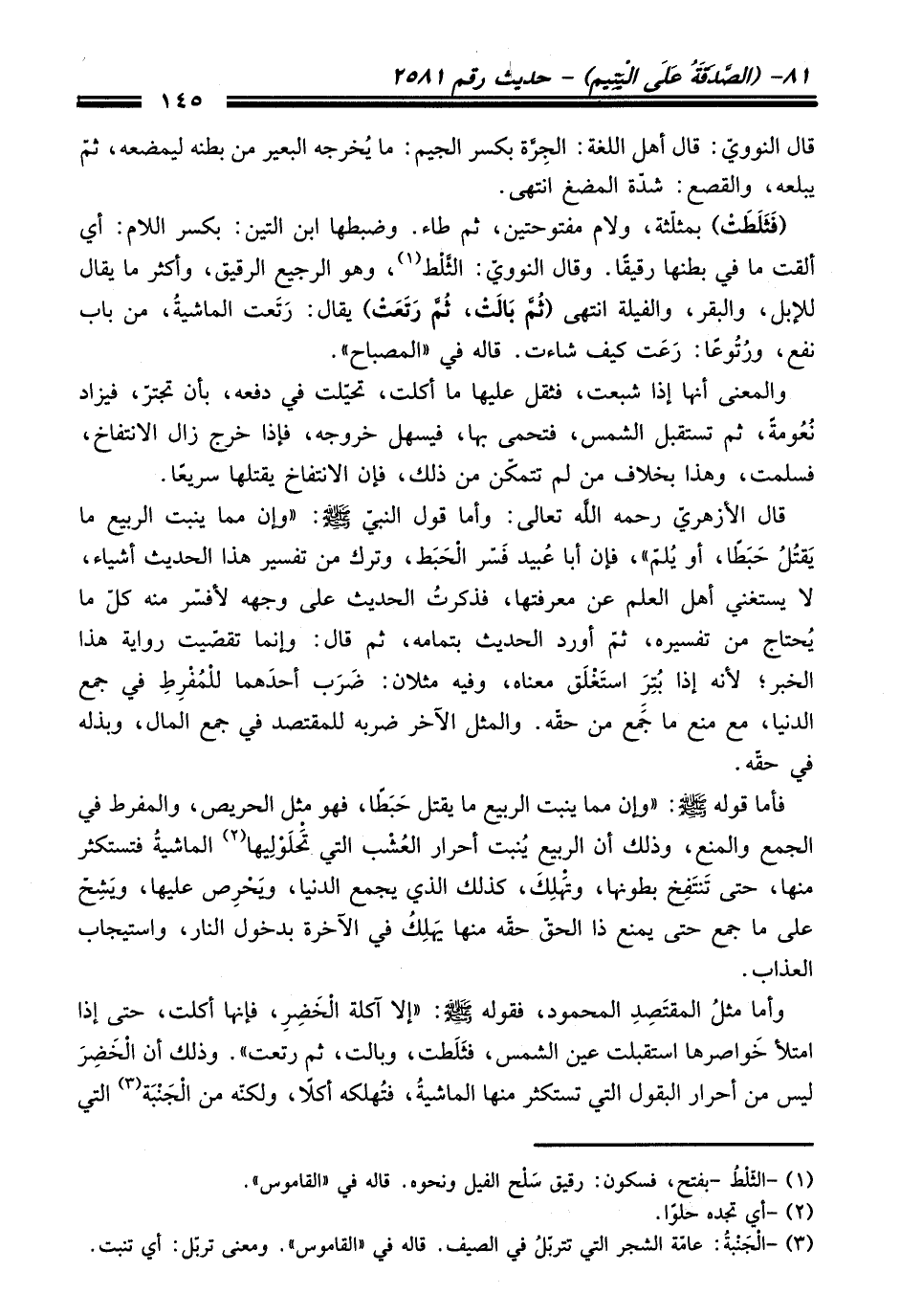 قال الأزهريّ -رحمه اللَّه تعالى-: وأما قول النبيّ - صلى اللَّه عليه وسلم -: "وإن مما ينبت الربيع ما يَقتُلُ حَبَطًا، أو يُلمّ"، فإن أبا عُبيد فَسّر الْحَبَط، وترك من تفسير هذا الحديث أشياء، لا يستغني أهل العلم عن معرفتها، فذكرتُ الحديث على وجهه لأفسّر منه كلّ ما يُحتاج من تفسيره، ثمّ أورد الحديث بتمامه، ثم قال: وإنما تقصّيت رواية هذا الخبر؛ لأنه إذا بُتِرَ استَغْلَق معناه، وفيه مثلان: ضَرَب أحدَهما للْمُفْرِطِ في جمع الدنيا، مع منع ما جمَع من حقّه. والمثل الآخر ضربه للمقتصد في جمع المال، وبذله في حقّه.