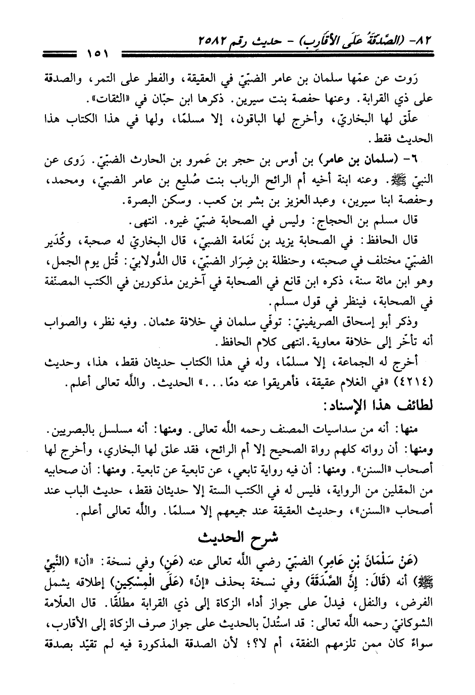 (عَنْ سَلْمَانَ بْن عَامِرٍ) الضبّيّ - رضي اللَّه تعالى عنه - (عَنِ) وفي نسخة: "أن" (النَّبِيِّ - صلى اللَّه عليه وسلم -) أنه (قَالَ: إِنَّ الصَّدَقَةَ) وفي نسخة بحذف "إنّ" (عَلَى الْمِسْكِينِ) إطلاقه يشمل الفرض، والنفل، فيدلّ على جواز أداء الزكاة إلى ذي القرابة مطلقًا. قال العلاّمة الشوكانيّ -رحمه اللَّه تعالى-: قد استُدلّ بالحديث على جواز صرف الزكاة إلى الأقارب، سواءٌ كان ممن تلزمهم النفقة، أم لا؟؛ لأن الصدقة المذكورة فيه لم تقيّد بصدقة