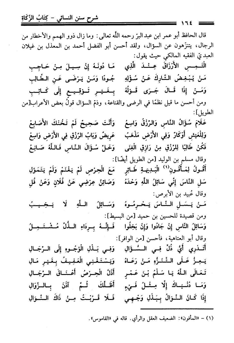 قال الحافظ أبو عمر ابن عبد البرّ -رحمه اللَّه تعالى-: وما زال ذوو الهمم والأخطار من الرجال، يتنزّهون عن السؤال، ولقد أحسن أبو الفضل أحمد بن المعذل بن غيلان العبديّ الفقيه المالكي حيث يقول: