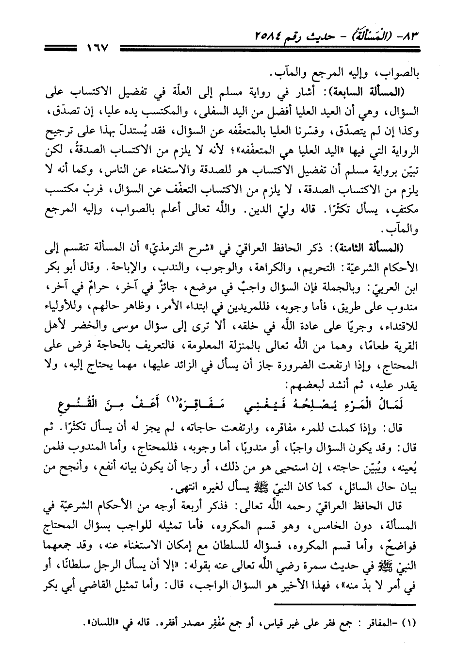 (المسألة السابعة): أشار في رواية مسلم إلى العلّة في تفضيل الاكتساب على السؤال، وهي أن العيد العليا أفضل من اليد السفلى، والمكتسب يده عليا، إن تصدّق، وكذا إن لم يتصدّق، وفسّرنا العليا بالمتعفّفه عن السؤال، فقد يُستدل بهذا على ترجيح الرواية التي فيها "اليد العليا هي المتعفّفه"؛ لأنه لا يلزم من الاكتساب الصدقةُ، لكن تبيّن برواية مسلم أن تفضيل الاكتساب هو للصدقة والاستغناء عن الناس، وكما أنه لا يلزم من الاكتساب الصدقة، لا يلزم من الاكتساب التعفّف عن السؤال، فربّ مكتسب مكتفِ، يسأل تكثّرًا. قاله وليّ الدين. واللَّه تعالى أعلم بالصواب، وإليه المرجع والمآب.