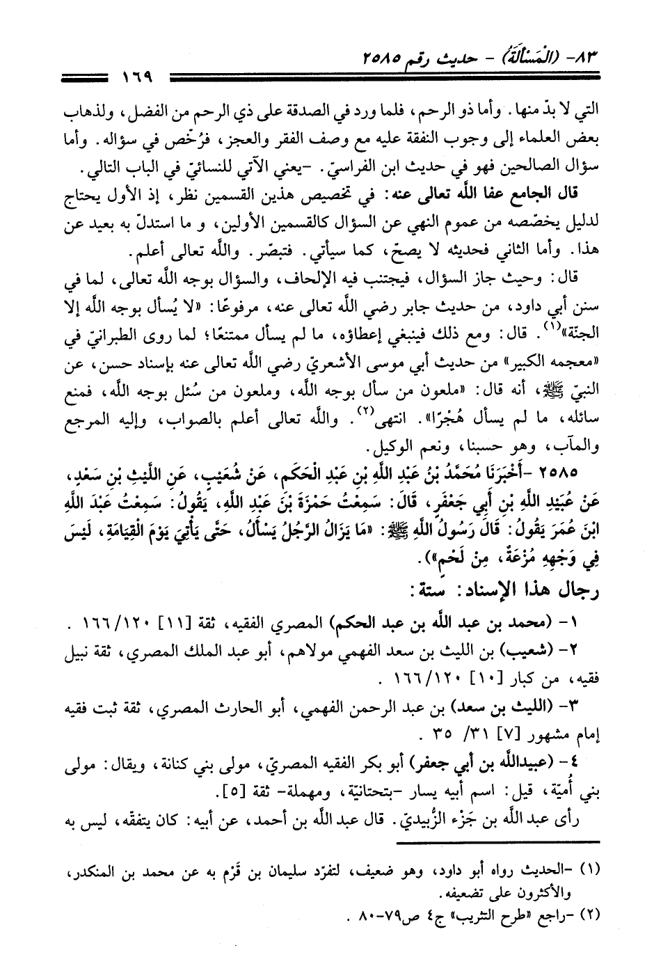 2585 - (أَخْبَرَنَا مُحَمَّدُ بْنُ عَبْدِ اللَّهِ بْنِ عَبْدِ الْحَكَمِ, عَنْ شُعَيْبٍ, عَنِ اللَّيْثِ بْنِ سَعْدٍ, عَنْ عُبَيْدِ اللَّهِ بْنِ أَبِي جَعْفَرٍ, قَالَ: سَمِعْتُ حَمْزَةَ بْنَ عَبْدِ اللَّهِ, يَقُولُ: سَمِعْتُ عَبْدَ اللَّهِ بْنَ عُمَرَ يَقُولُ: قَالَ رَسُولُ اللَّهِ - صلى اللَّه عليه وسلم -: «مَا يَزَالُ الرَّجُلُ يَسْأَلُ, حَتَّى يَأْتِىَ يَوْمَ الْقِيَامَةِ, لَيْسَ فِي وَجْهِهِ مُزْعَةٌ, مِنْ لَحْمٍ»).