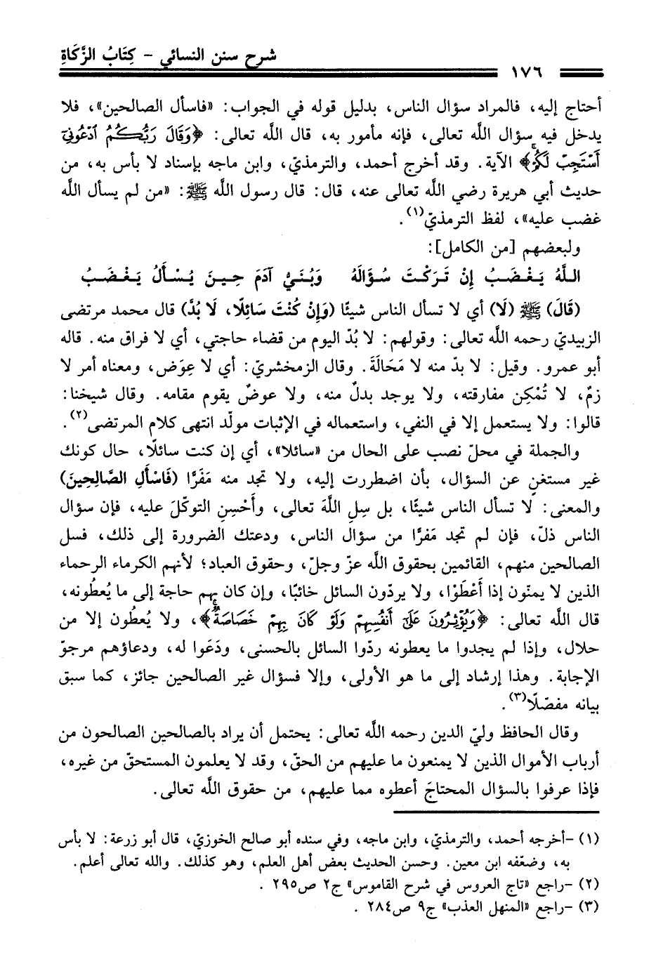 والجملة في محلّ نصب على الحال من "سائلا"، أي إن كنت سائلًا، حال كونك غير مستغنٍ عن السؤال، بأن اضطررت إليه، ولا تجد منه مَفَرًّا (فَاسْأَلِ الصَّالِحِينَ) والمعنى: لا تسأل الناس شيئًا، بل سِلِ اللَّهَ تعالى، وأَحْسِنِ التوكّلَ عليه، فإن سؤال الناس ذلّ، فإن لم تجد مَفرًّا من سؤال الناس، ودعتك الضرورة إلى ذلك، فسل الصالحين منهم، القائمين بحقوق اللَّه -عَزَّ وَجَلَّ-، وحقوق العباد؛ لأنهم الكرماء الرحماء الذين لا يمنّون إذا أَعْطَوْا، ولا يردّون السائل خائبًا، وإن كان بهم حاجة إلى ما يُعطُونه، قال اللَّه تعالى: {وَيُؤْثِرُونَ عَلَى أَنْفُسِهِمْ وَلَوْ كَانَ بِهِمْ خَصَاصَةٌ}، ولا يُعطُون إلا من حلال، وإذا لم يجدوا ما يعطونه ردوا السائل بالحسنى، ودَعَوا له، ودعاؤهم مرجوّ الإجابة. وهذا إرشاد إلى ما هو الأولى، وإلا فسؤال غير الصالحين جائز، كما سبق بيانه مفصّلاً (¬3).