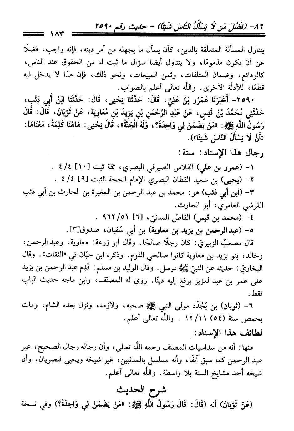 2590 - (أَخْبَرَنَا عَمْرُو بْنُ عَلِيٍّ, قَالَ: حَدَّثَنَا يَحْيَى, قَالَ: حَدَّثَنَا ابْنُ أَبِي ذِئْبٍ, حَدَّثَنِي مُحَمَّدُ بْنُ قَيْسٍ, عَنْ عَبْدِ الرَّحْمَنِ بْنِ يَزِيدَ بْنِ مُعَاوِيَةَ, عَنْ ثَوْبَانَ, قَالَ: قَالَ رَسُولُ اللَّهِ - صلى اللَّه عليه وسلم -: «مَنْ يَضْمَنْ لِي وَاحِدَةً؟ , وَلَهُ الْجَنَّةُ» , قَالَ يَحْيَى: هَاهُنَا كَلِمَةٌ, مَعْنَاهَا: "أَنْ لاَ يَسْأَلَ النَّاسَ شَيْئًا").