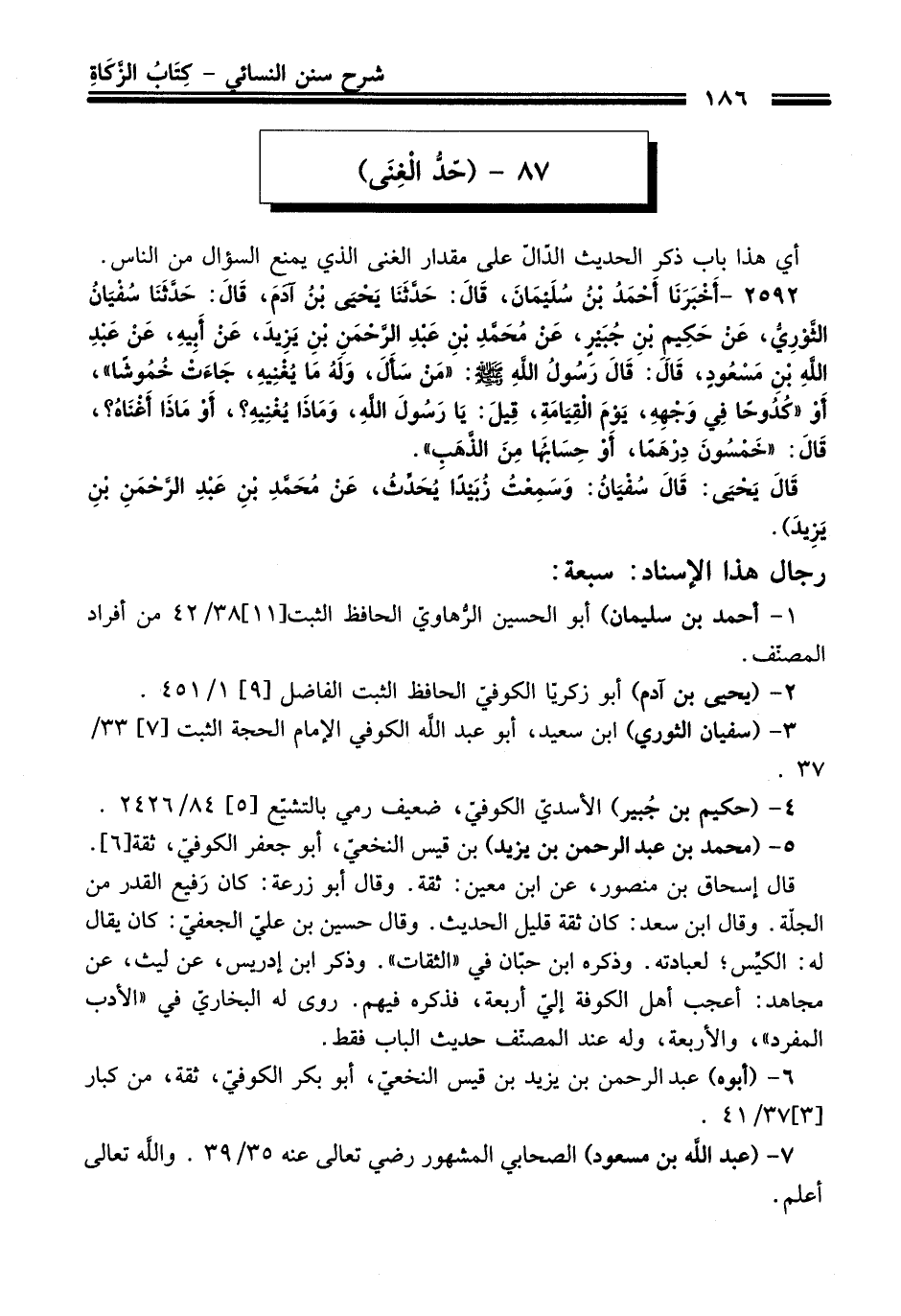 2592 - (أَخْبَرَنَا أَحْمَدُ بْنُ سُلَيْمَانَ, قَالَ: حَدَّثَنَا يَحْيَى بْنُ آدَمَ, قَالَ: حَدَّثَنَا سُفْيَانُ الثَّوْرِيُّ, عَنْ حَكِيمِ بْنِ جُبَيْرٍ, عَنْ مُحَمَّدِ بْنِ عَبْدِ الرَّحْمَنِ بْنِ يَزِيدَ, عَنْ أَبِيهِ, عَنْ عَبْدِ اللَّهِ بْنِ مَسْعُودٍ, قَالَ: قَالَ رَسُولُ اللَّهِ - صلى اللَّه عليه وسلم -: «مَنْ سَأَلَ, وَلَهُ مَا يُغْنِيهِ, جَاءَتْ خُمُوشًا", أَوْ "كُدُوحًا فِي وَجْهِهِ, يَوْمَ الْقِيَامَةِ, قِيلَ: يَا رَسُولَ اللَّهِ, وَمَاذَا يُغْنِيهِ؟ , أَوْ مَاذَا أَغْنَاهُ؟ , قَالَ: «خَمْسُونَ دِرْهَمًا, أَوْ حِسَابُهَا مِنَ الذَّهَبِ». قَالَ: يَحْيَى قَالَ سُفْيَانُ: وَسَمِعْتُ زُبَيْدًا يُحَدِّثُ, عَنْ مُحَمَّدِ بْنِ عَبْدِ الرَّحْمَنِ بْنِ يَزِيدَ).