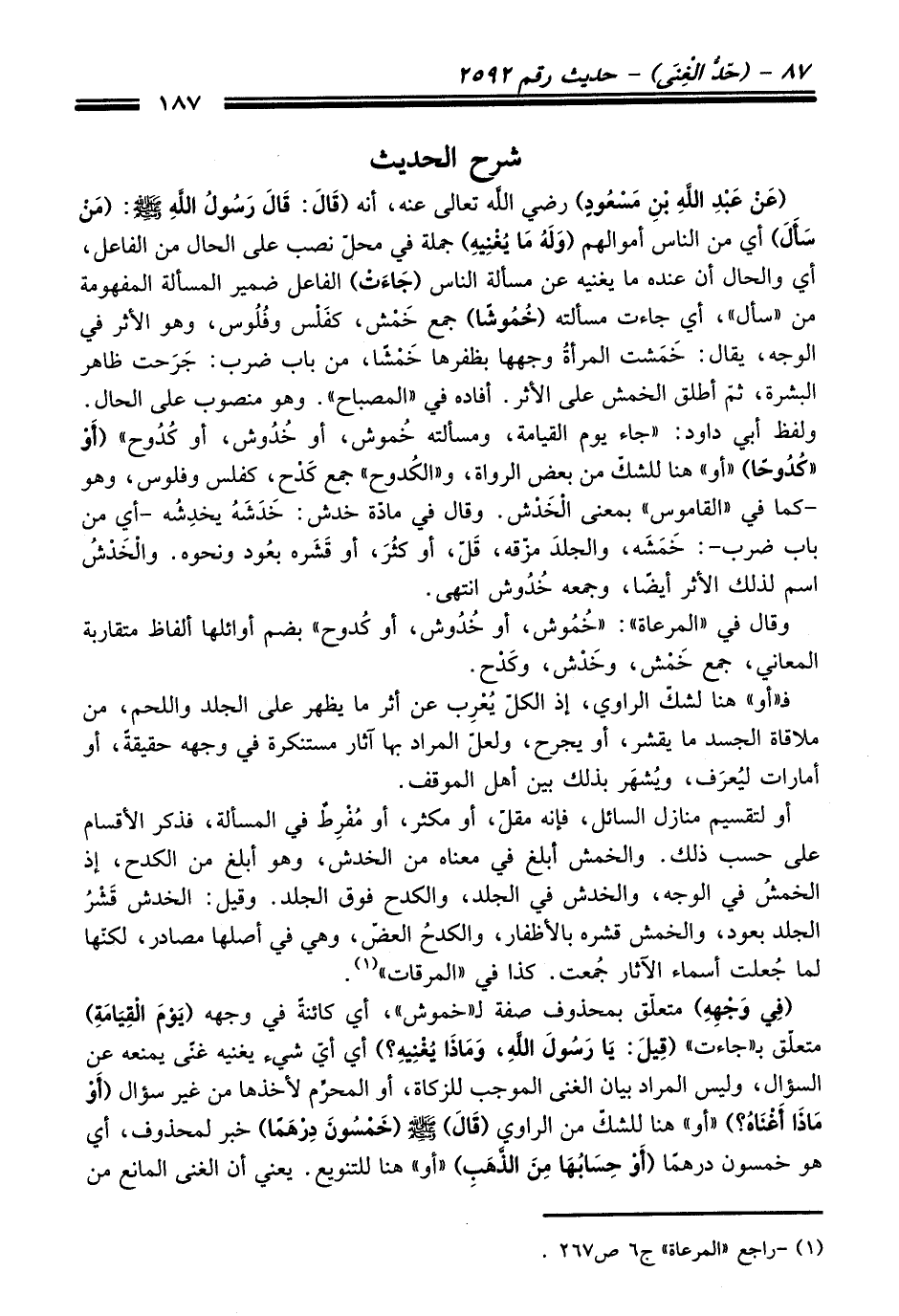 (عَنْ عَبْدِ اللَّهِ بْنِ مَسْعُودٍ) - رضي اللَّه تعالى عنه -، أنه (قَالَ: قَالَ رَسُولُ اللَّهِ - صلى اللَّه عليه وسلم -: (مَنْ سَأَلَ) أي من الناس أموالهم (وَلَهُ مَا يُغْنِيهِ) جملة في محلّ نصب على الحال من الفاعل، أي والحال أن عنده ما يغنيه عن مسألة الناس (جَاءَتْ) الفاعل ضمير المسألة المفهومة من "سأل"، أي جاءت مسألته (خُمُوشًا) جمع خَمْش، كفَلْس وفُلُوس، وهو الأثر في الوجه، يقال: خَمَشت المرأةُ وجهها بظفرها خَمْشًا، من باب ضرب: جَرَحت ظاهر البشرة، ثمّ أطلق الخمش على الأثر. أفاده في "المصباح". وهو منصوب على الحال. ولفظ أبي داود: "جاء يوم القيامة، ومسألته خُموش، أو خُدُوش، أو كُدُوح" (أَوْ "كُدُوحًا") "أو" هنا للشكّ من بعض الرواة، و"الكُدوح" جمع كَدْح، كفلس وفلوس، وهو -كما في "القاموس" بمعنى الْخَدْش. وقال في مادّة خدش: خَدَشَهُ يخدِشُه -أي من باب ضرب-: خَمَشَه، والجلدَ مزّقه، قَلّ، أو كثُرَ، أو قَشَره بعُود ونحوه. والْخَدْشُ اسم لذلك الأثر أيضًا، وجمعه خُدُوش انتهى.
