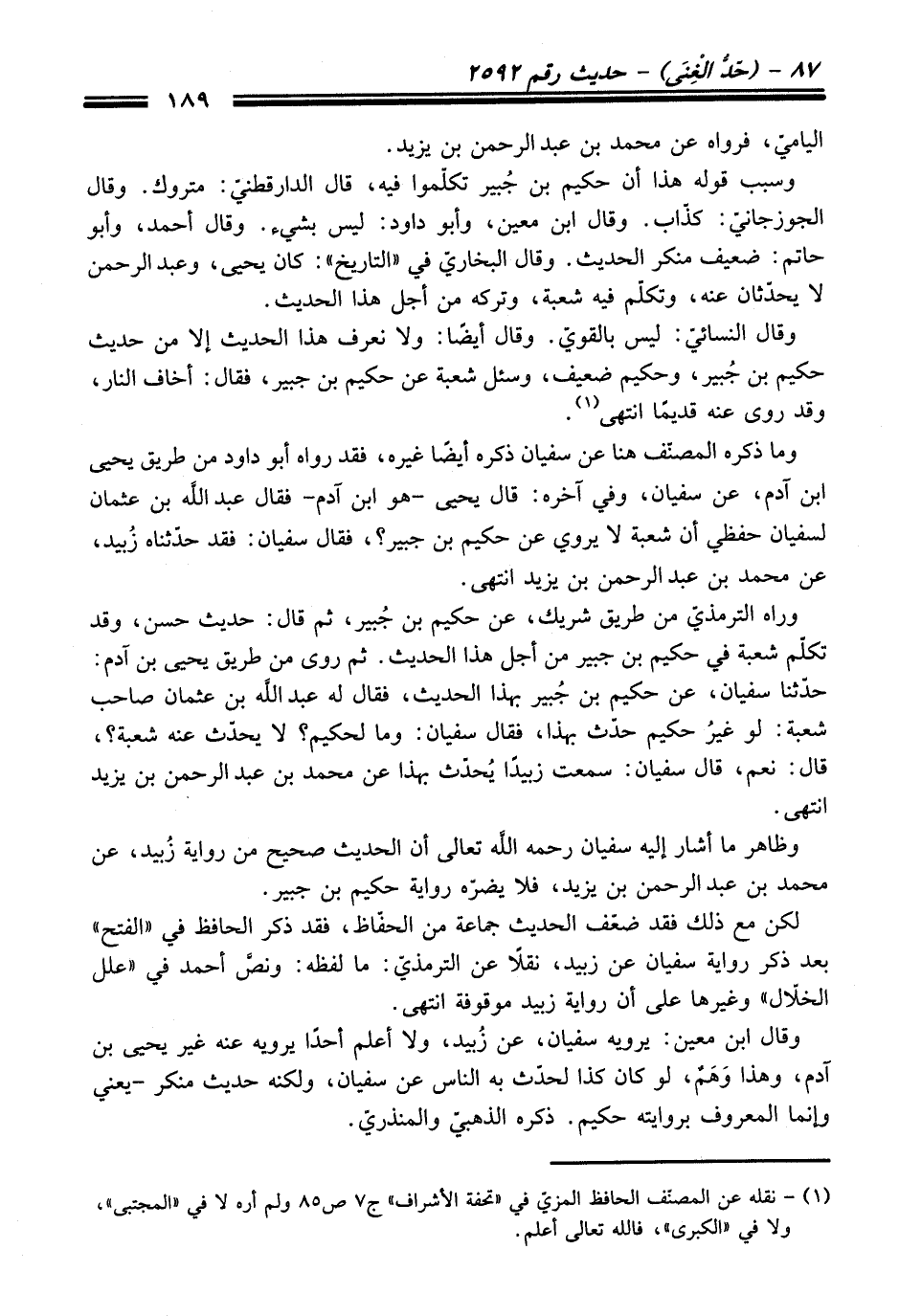 وظاهر ما أشار إليه سفيان -رحمه اللَّه تعالى- أن الحديث صحيح من رواية زُبيد، عن محمد بن عبد الرحمن بن يزيد، فلا يضرّه رواية حكيم بن جبير.