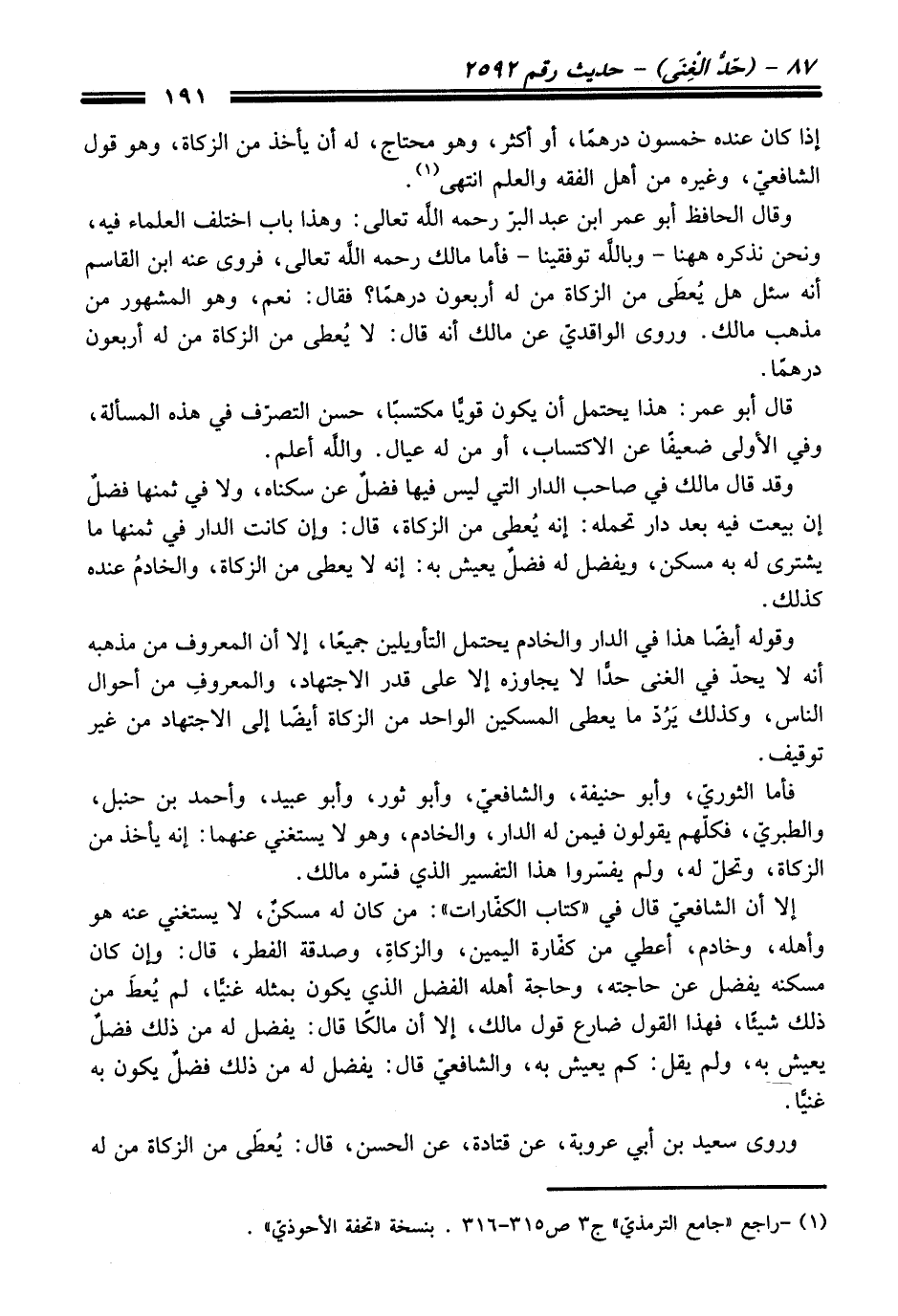 وقال الحافظ أبو عمر ابن عبد البرّ -رحمه اللَّه تعالى-: وهذا باب اختلف العلماء فيه، ونحن نذكره ههنا - وباللَّه توفيقنا - فأما مالك -رحمه اللَّه تعالى-، فروى عنه ابن القاسم أنه سئل هل يُعطَى من الزكاة من له أربعون درهمًا؟ فقال: نعم، وهو المشهور من مذهب مالك. وروى الواقديّ عن مالك أنه قال: لا يُعطى من الزكاة من له أربعون درهمًا.