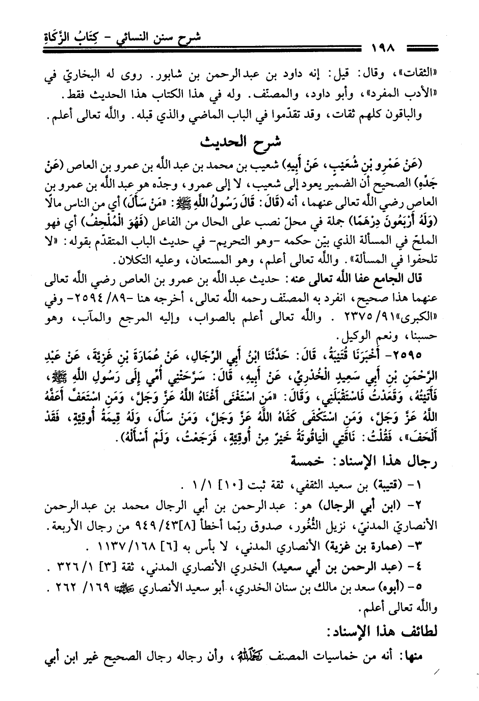 2595 - (أَخْبَرَنَا قُتَيْبَةُ, قَالَ: حَدَّثَنَا ابْنُ أَبِي الرِّجَالِ, عَنْ عُمَارَةَ بْنِ غَزِيَّةَ, عَنْ عَبْدِ الرَّحْمَنِ بْنِ أَبِي سَعِيدٍ الْخُدْرِيِّ, عَنْ أَبِيهِ, قَالَ: سَرَّحَتْنِي أُمِّي إِلَى رَسُولِ اللَّهِ - صلى اللَّه عليه وسلم -, فَأَتَيْتُهُ, وَقَعَدْتُ فَاسْتَقْبَلَنِي, وَقَالَ «مَنِ اسْتَغْنَى أَغْنَاهُ اللَّهُ -عَزَّ وَجَلَّ-, وَمَنِ اسْتَعَفَّ أَعَفَّهُ اللَّهُ -عَزَّ وَجَلَّ-, وَمَنِ اسْتَكْفَى كَفَاهُ اللَّهُ -عَزَّ وَجَلَّ-, وَمَنْ سَأَلَ, وَلَهُ قِيمَةُ أُوقِيَّةٍ, فَقَدْ أَلْحَفَ» , فَقُلْتُ: نَاقَتِي الْيَاقُوتَةُ خَيْرٌ مِنْ أُوقِيَّةٍ, فَرَجَعْتُ, وَلَمْ أَسْأَلْهُ).