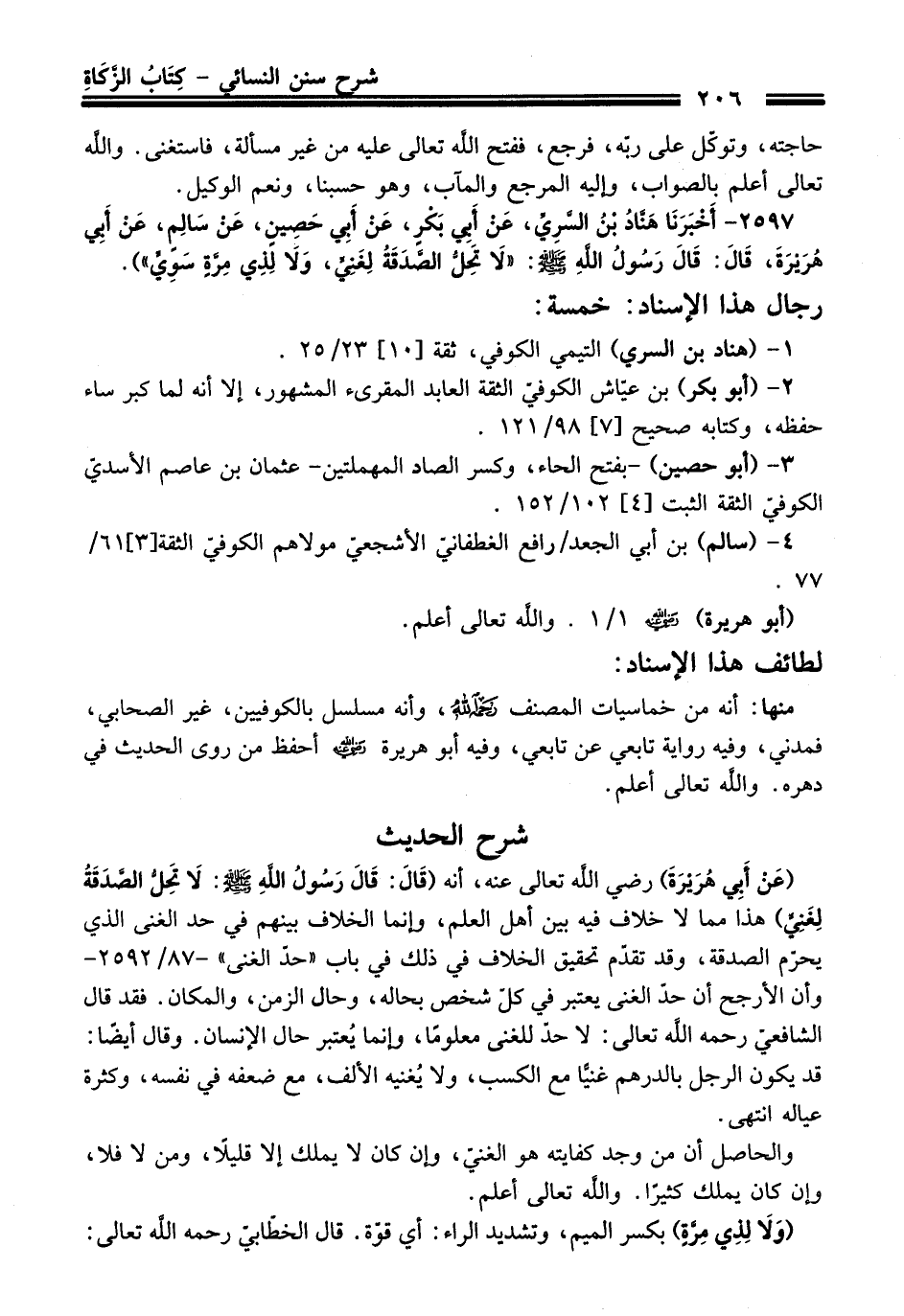 2597 - (أَخْبَرَنَا هَنَّادُ بْنُ السَّرِيِّ, عَنْ أَبِي بَكْرٍ, عَنْ أَبِي حَصِينٍ, عَنْ سَالِمٍ, عَنْ أَبِي هُرَيْرَةَ, قَالَ: قَالَ رَسُولُ اللَّهِ - صلى اللَّه عليه وسلم -: «لاَ تَحِلُّ الصَّدَقَةُ لِغَنِيٍّ, وَلاَ لِذِي مِرَّةٍ سَوِيٍّ»).