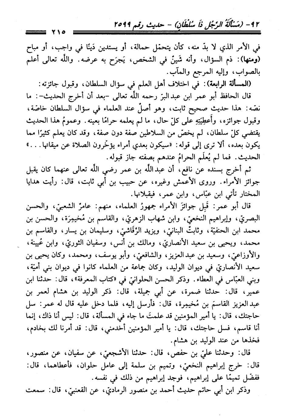 (المسألة الرابعة): في اختلاف أهل العلم في سؤال السلطان، وقبول جائزته: