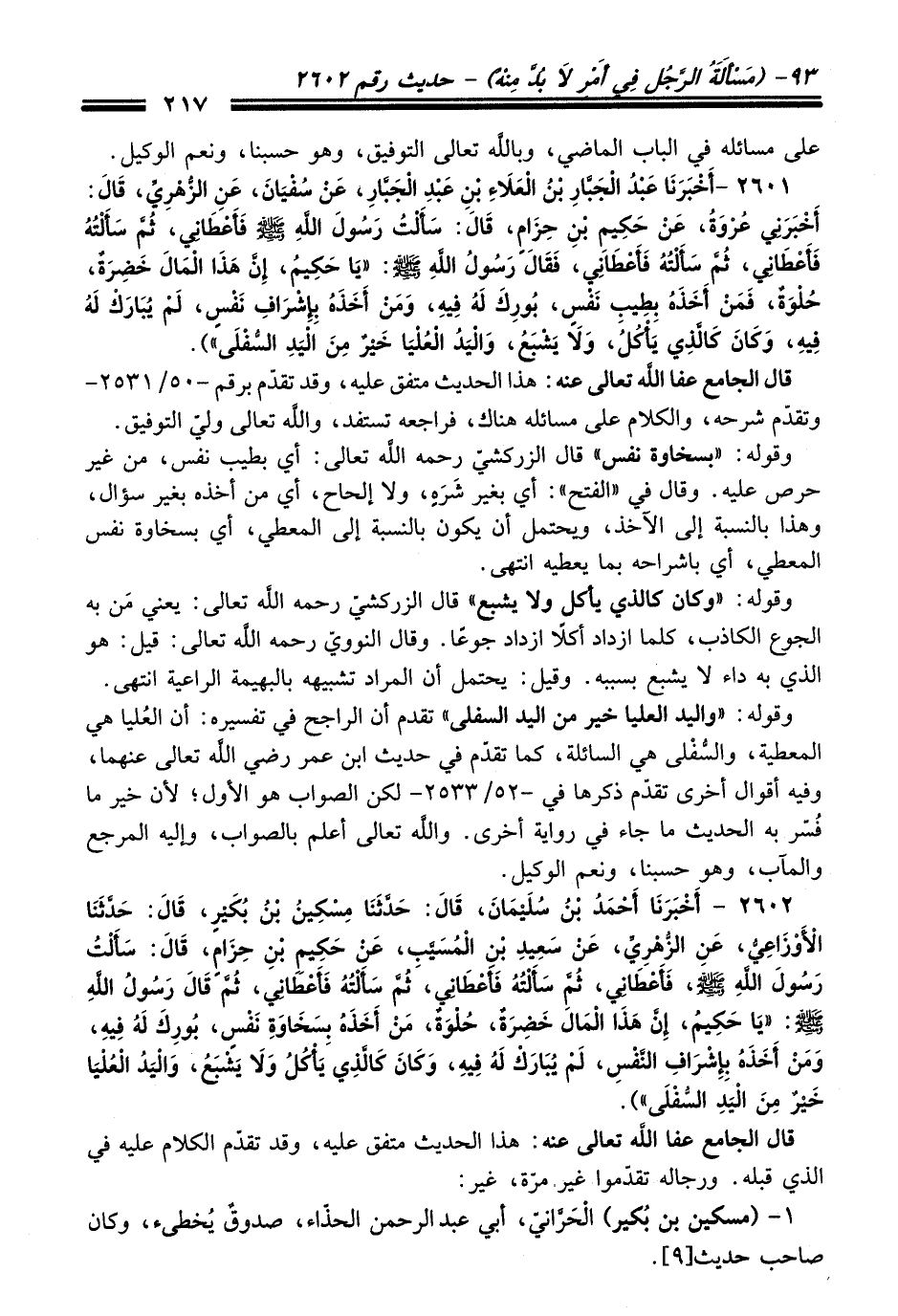 2602 - (أَخْبَرَنَا أَحْمَدُ بْنُ سُلَيْمَانَ, قَالَ: حَدَّثَنَا مِسْكِينُ بْنُ بُكَيْرٍ, قَالَ: حَدَّثَنَا الأَوْزَاعِيُّ, عَنِ الزُّهْرِيِّ, عَنْ سَعِيدِ بْنِ الْمُسَيَّبِ, عَنْ حَكِيمِ بْنِ حِزَامٍ, قَالَ: سَأَلْتُ رَسُولَ اللَّهِ - صلى اللَّه عليه وسلم -, فَأَعْطَانِي, ثُمَّ سَأَلْتُهُ فَأَعْطَانِي, ثُمَّ سَأَلْتُهُ فَأَعْطَانِي, ثُمَّ قَالَ رَسُولُ اللَّهِ - صلى اللَّه عليه وسلم -: «يَا حَكِيمُ, إِنَّ هَذَا الْمَالَ خَضِرَةٌ, حُلْوَةٌ, مَنْ أَخَذَهُ بِسَخَاوَةِ نَفْسٍ, بُورِكَ لَهُ فِيهِ, وَمَنْ أَخَذَهُ بِإِشْرَافِ النَّفْسِ, لَمْ يُبَارَكْ لَهُ فِيهِ, وَكَانَ كَالَّذِي يَأْكُلُ وَلاَ يَشْبَعُ, وَالْيَدُ الْعُلْيَا خَيْرٌ مِنَ الْيَدِ السُّفْلَى»).