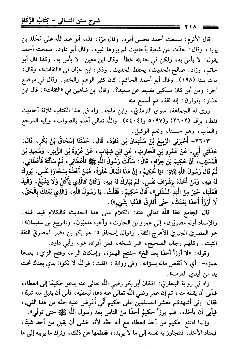 2603 - (أَخْبَرَنِي الرَّبِيعُ بْنُ سُلَيْمَانَ بْنِ دَاوُدَ, قَالَ: حَدَّثَنَا إِسْحَاقُ بْنُ بَكْرٍ, قَالَ: حَدَّثَنِي أَبِي, عَنْ عَمْرِو بْنِ الْحَارِثِ, عَنِ ابْنِ شِهَابٍ, عَنْ عُرْوَةَ بْنِ الزُّبَيْرِ, وَسَعِيدِ بْنِ الْمُسَيَّبِ, أَنَّ حَكِيمَ بْنَ حِزَامٍ, قَالَ: سَأَلْتُ رَسُولَ اللَّهِ - صلى اللَّه عليه وسلم - فَأَعْطَانِي, ثُمَّ سَأَلْتُهُ فَأَعْطَانِي, ثُمَّ قَالَ رَسُولُ اللَّهِ - صلى اللَّه عليه وسلم -: «يَا حَكِيمُ, إِنَّ هَذَا الْمَالَ حُلْوَةٌ, فَمَنْ أَخَذَهُ بِسَخَاوَةِ نَفْسٍ, بُورِكَ لَهُ فِيهِ, وَمَنْ أَخَذَهُ بِإِشْرَافِ نَفْسٍ, لَمْ يُبَارَكْ لَهُ فِيهِ, وَكَانَ كَالَّذِي يَأْكُلُ وَلاَ يَشْبَعُ, وَالْيَدُ الْعُلْيَا, خَيْرٌ مِنَ الْيَدِ السُّفْلَى» , قَالَ حَكِيمٌ: فَقُلْتُ: يَا رَسُولَ اللَّهِ, وَالَّذِي بَعَثَكَ بِالْحَقِّ, لاَ أَرْزَأُ أَحَدًا بَعْدَكَ, حَتَّى أُفَارِقَ الدُّنْيَا بِشَيْءٍ).
