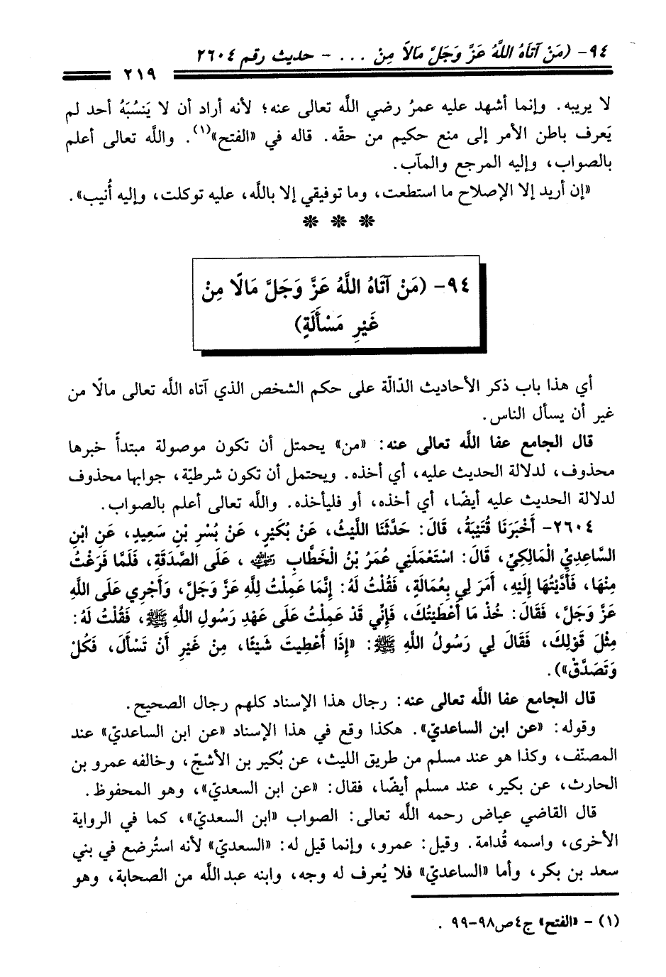 94 - (مَنْ آتَاهُ اللَّه -عَزَّ وَجَلَّ- مَالًا مِنْ غَيْرِ مَسْأَلَةٍ)