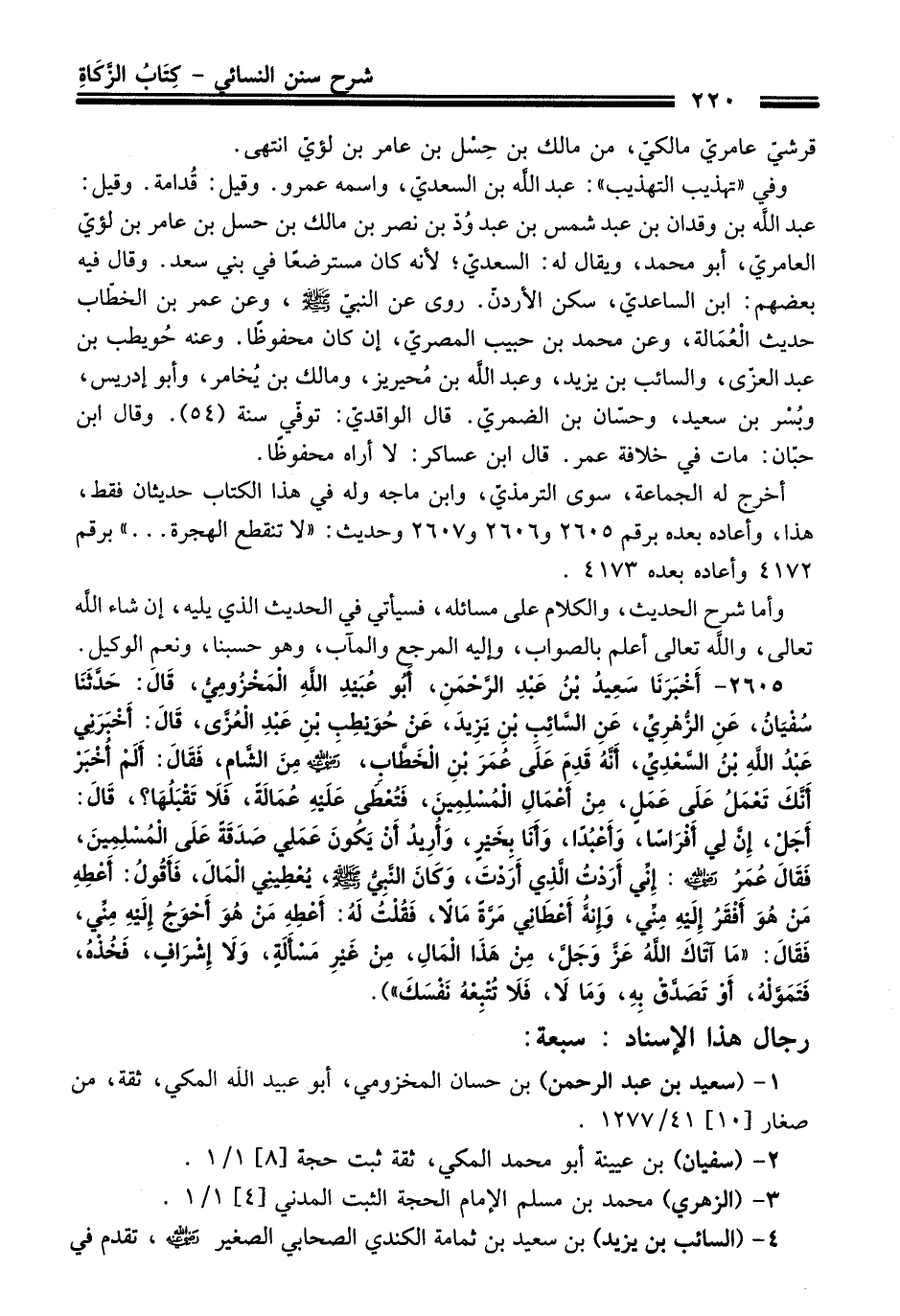 2605 - (أَخْبَرَنَا سَعِيدُ بْنُ عَبْدِ الرَّحْمَنِ, أَبُو عُبَيْدِ اللَّهِ الْمَخْزُومِيُّ, قَالَ: حَدَّثَنَا سُفْيَانُ, عَنِ الزُّهْرِيِّ, عَنِ السَّائِبِ بْنِ يَزِيدَ, عَنْ حُوَيْطِبِ بْنِ عَبْدِ الْعُزَّى, قَالَ: أَخْبَرَنِي عَبْدُ اللَّهِ بْنُ السَّعْدِيِّ, أَنَّهُ قَدِمَ عَلَى عُمَرَ بْنِ الْخَطَّابِ, - رضي اللَّه عنه - مِنَ الشَّامِ, فَقَالَ: أَلَمْ أُخْبَرْ أَنَّكَ تَعْمَلُ عَلَى عَمَلٍ, مِنْ أَعْمَالِ الْمُسْلِمِينَ, فَتُعْطَى عَلَيْهِ عُمَالَةً, فَلاَ تَقْبَلُهَا؟ , قَالَ: أَجَلْ, إِنَّ لِي أَفْرَاسًا, وَأَعْبُدًا, وَأَنَا بِخَيْرٍ, وَأُرِيدُ أَنْ يَكُونَ عَمَلِي صَدَقَةً عَلَى الْمُسْلِمِينَ, فَقَالَ: عُمَرُ - رضي اللَّه عنه - إِنِّي أَرَدْتُ الَّذِي أَرَدْتَ, وَكَانَ النَّبِيُّ - صلى اللَّه عليه وسلم - يُعْطِينِى الْمَالَ, فَأَقُولُ: أَعْطِهِ مَنْ هُوَ أَفْقَرُ إِلَيْهِ مِنِّي, وَإِنَّهُ أَعْطَانِى مَرَّةً مَالاً, فَقُلْتُ لَهُ: أَعْطِهِ مَنْ هُوَ أَحْوَجُ إِلَيْهِ مِنِّي, فَقَالَ: «مَا آتَاكَ اللَّهُ -عَزَّ وَجَلَّ-, مِنْ هَذَا الْمَالِ, مِنْ غَيْرِ مَسْأَلَةٍ, وَلاَ إِشْرَافٍ, فَخُذْهُ, فَتَمَوَّلْهُ, أَوْ تَصَدَّقْ بِهِ, وَمَا لاَ, فَلاَ تُتْبِعْهُ نَفْسَكَ»).