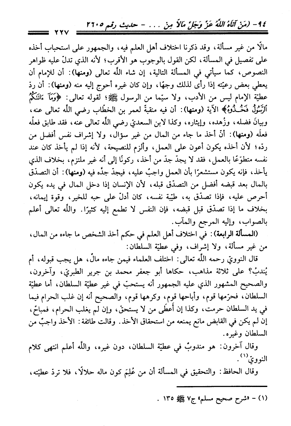 (المسألة الرابعة): في اختلاف أهل العلم في حكم أخذ الشخص ما جاءه من المال، من غير مسألة، ولا إشراف، وفي عطيّة السلطان: